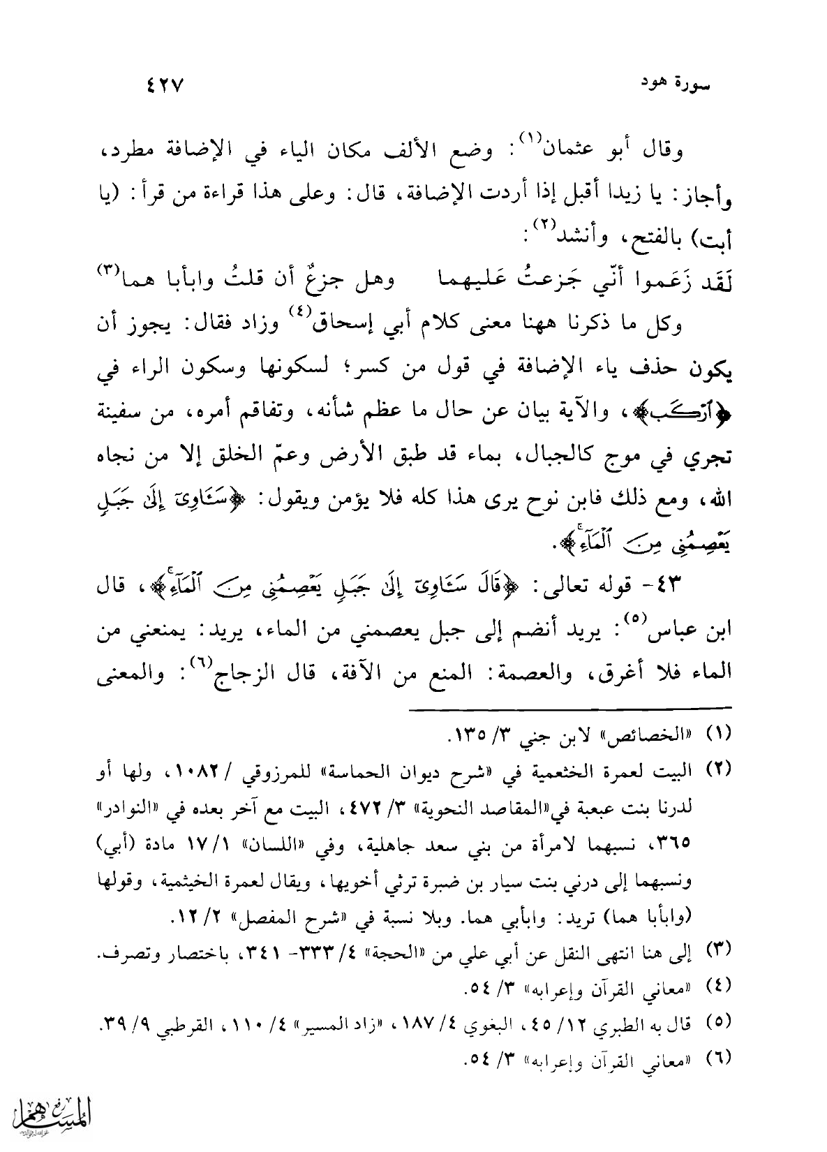وكل ما ذكرنا هاهنا معنى كلام أبي إسحاق (¬4) وزاد فقال: يجوز أن يكون حذف ياء الإضافة في قول من كسر؛ لسكونها وسكون الراء في {أرْكَب}، والآية بيان عن حال ما عظم شأنه، وتفاقم أمره، من سفينة تجري في موج كالجبال، بماء قد طبق الأرض وعمّ الخلق إلا من نجاه الله، ومع ذلك فابن نوح يرى هذا كله فلا يؤمن ويقول: {سَآوِي إِلَى جَبَلٍ يَعْصِمُنِي مِنَ الْمَاءِ}