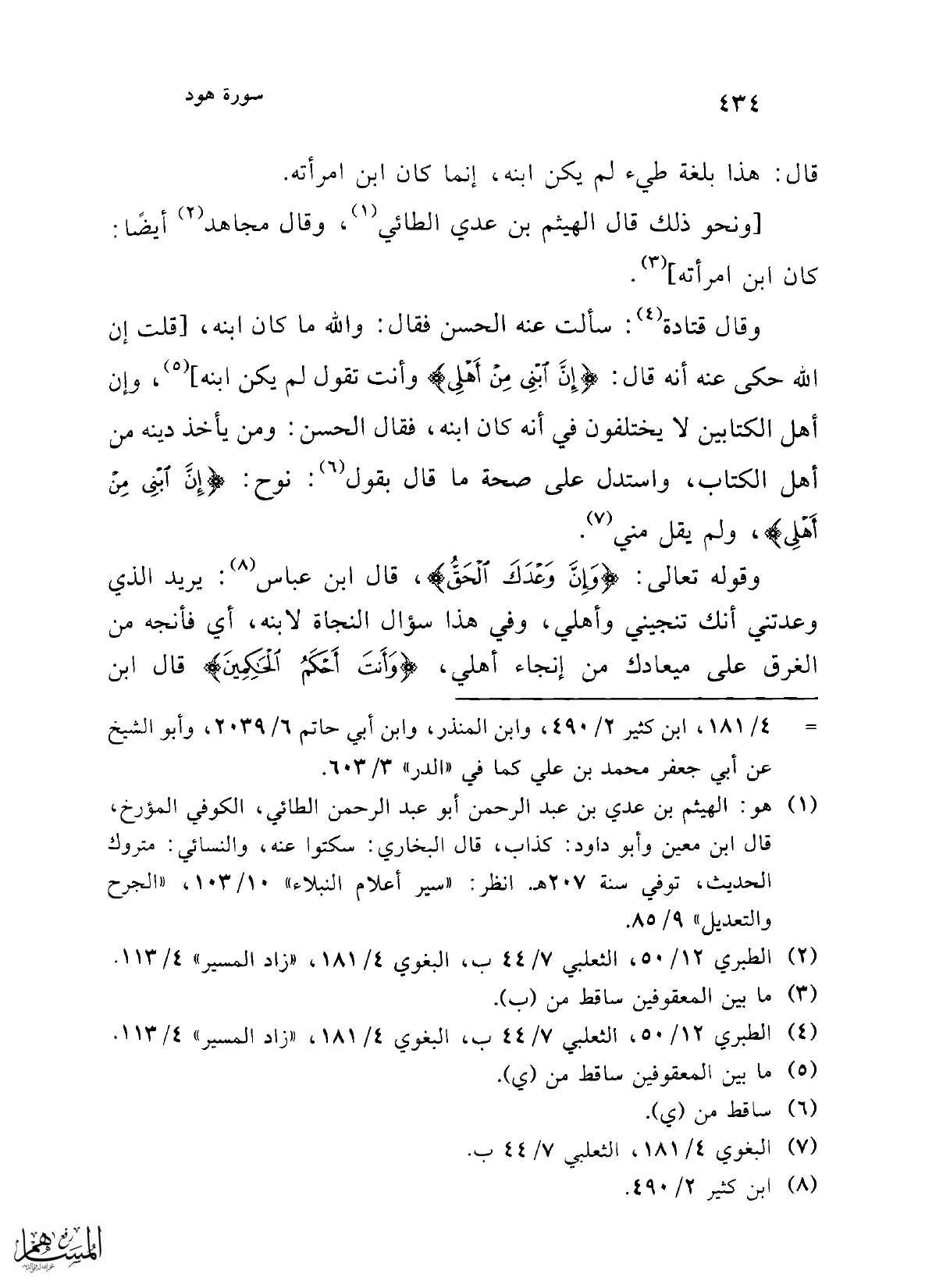 وقال قتادة (¬4): سألت عنه الحسن فقال: والله ما كان ابنه، [قلت إن الله حكى عنه أنه قال: {إِنَّ ابْنِي مِنْ أَهْلِي} وأنت تقول لم يكن ابنه] (¬5)، وإن أهل الكتابين لا يختلفون في أنه كان ابنه، فقال الحسن: ومن يأخذ دينه من أهل الكتاب، واستدل على صحة ما قال يقول (¬6): نوح: {إِنَّ ابْنِي مِنْ أَهْلِي}، ولم يقل مني (¬7).