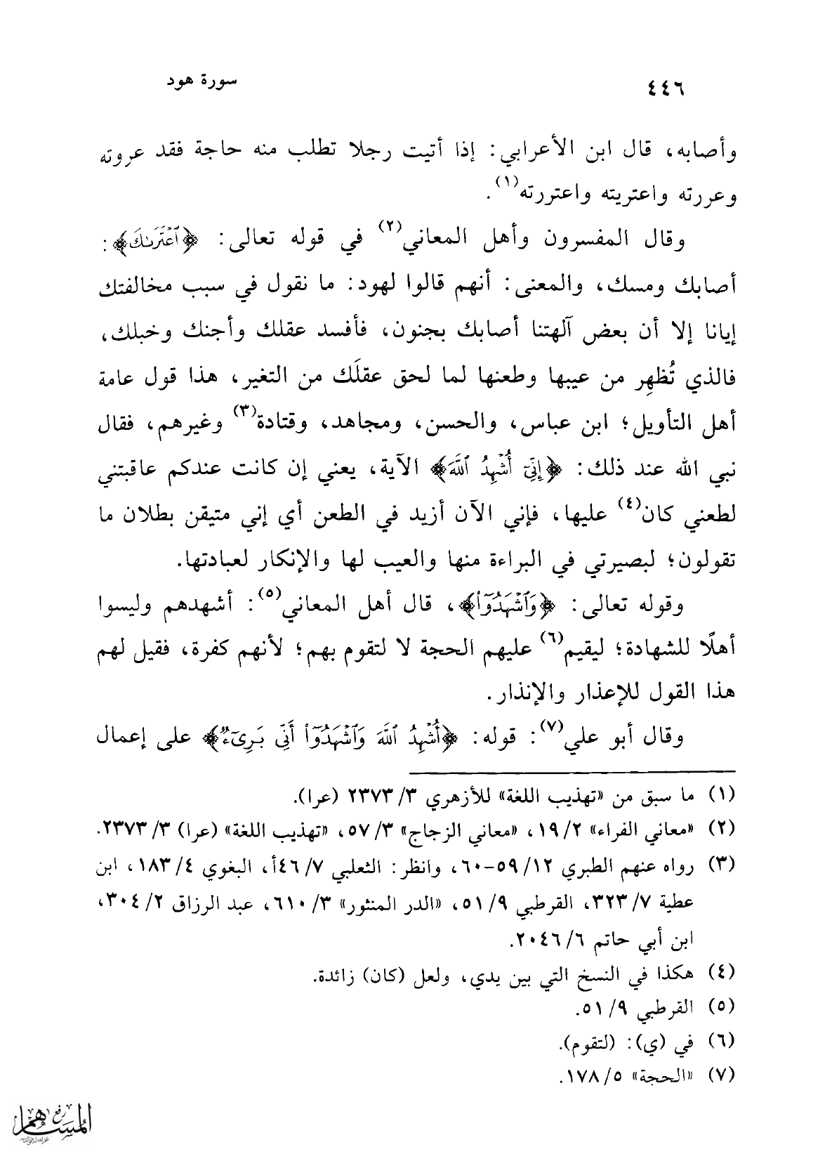 وقال المفسرون وأهل المعاني (¬2) في قوله تعالى: {اعْتَرَاكَ}: أصابك ومسك، والمعنى: أنهم قالوا لهود: ما نقول في سبب مخالفتك إيانا إلا أن بعض آلهتنا أصابك بجنون، فأفسد عقلك وأجنك وخبلك، فالذي تُظهِر من عيبها وطعنها لما لحق عقلَك من التغير، هذا قول عامة أهل التأويل؛ ابن عباس، والحسن، ومجاهد، وقتادة (¬3) وغيرهم، فقال نبي الله عند ذلك: {إِنِّي أُشْهِدُ اللَّهَ} الآية، يعني إن كانت عندكم عاقبتني لطعني كان (¬4) عليها، فإني الآن أزيد في الطعن أي إني متيقن بطلان ما تقولون؛ لبصيرتي في البراءة منها والعيب لها والإنكار لعبادتها.