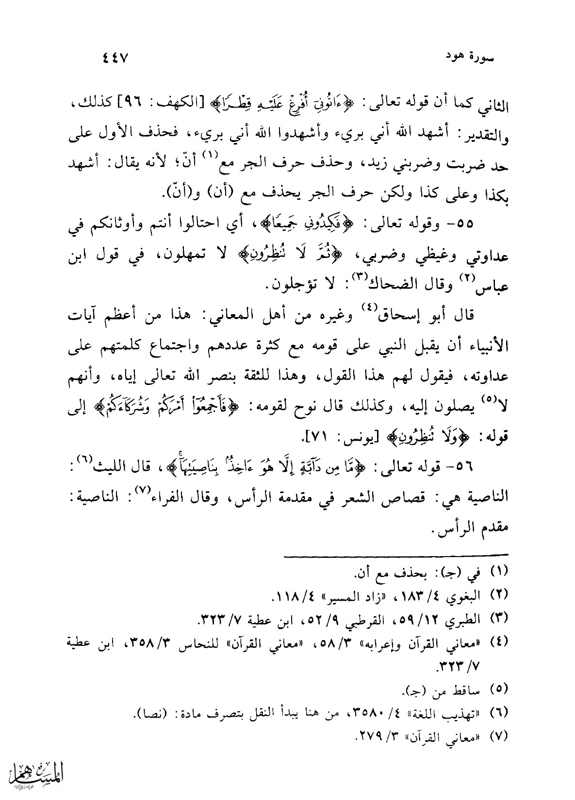 56 - قوله تعالى: {مَا مِنْ دَابَّةٍ إِلَّا هُوَ آخِذٌ بِنَاصِيَتِهَا}، قال الليث (¬6): الناصية هي: قصاص الشعر في مقدمة الرأس، وقال الفراء (¬7): الناصية: مقدم الرأس.