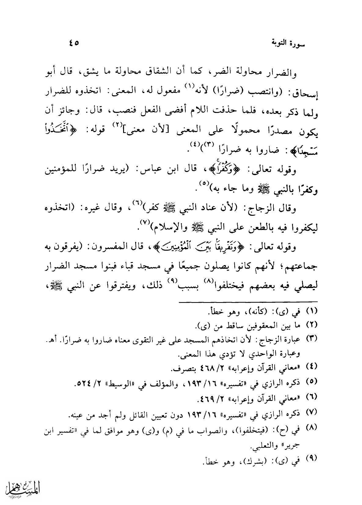 (¬3) عبارة الزجاج: لأن اتخاذهم المسجد على غير التقوى معناه ضاروا به ضرارًا. أهـ. وعبارة الواحدي لا تؤدي هذا المعنى.