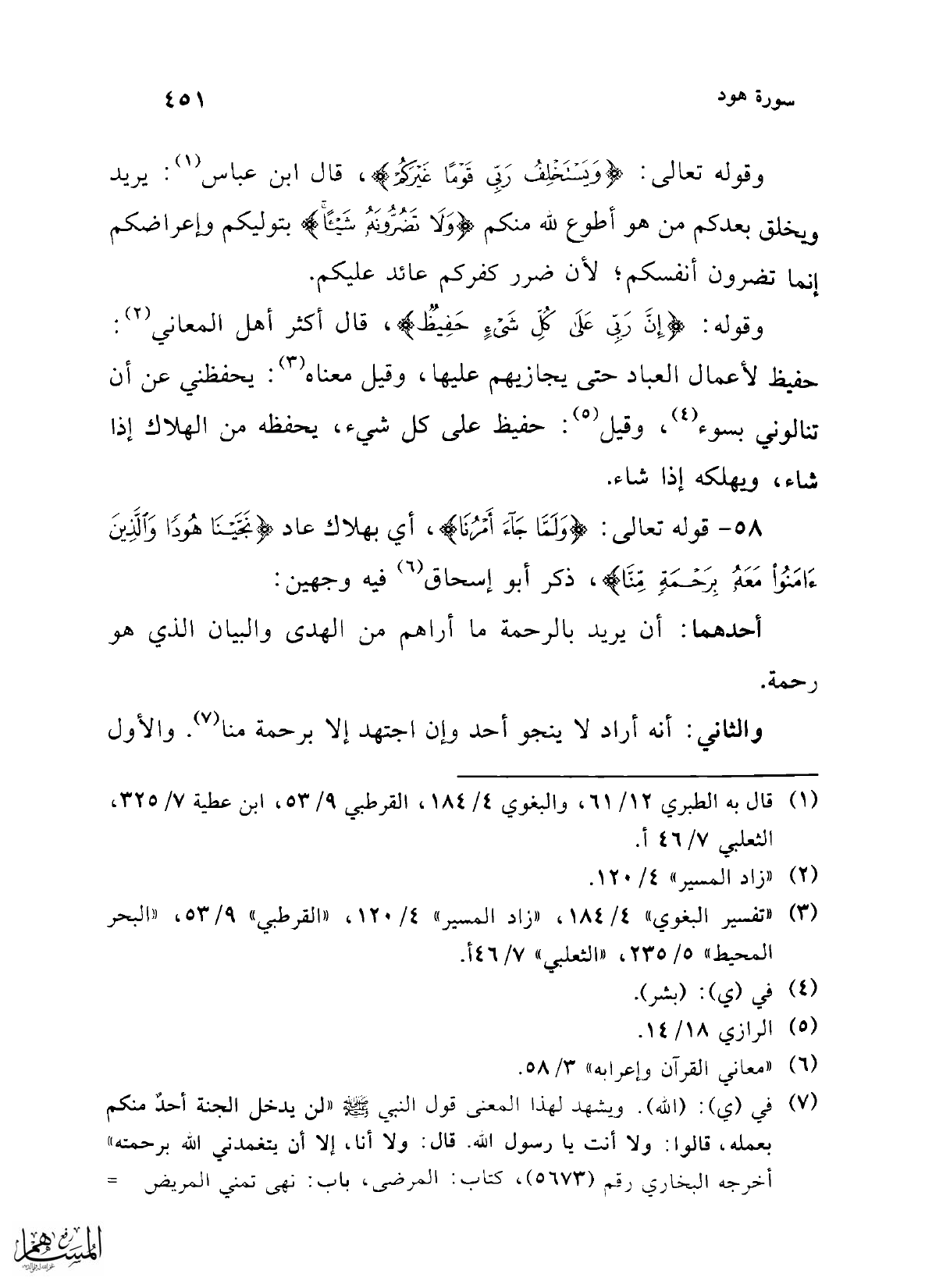 وقوله تعالى: {وَيَسْتَخْلِفُ رَبِّي قَوْمًا غَيْرَكُمْ}، قال ابن عباس (¬1): يريد ويخلق بعدكم من هو أطوع لله منكم {وَلَا تَضُرُّونَهُ شَيْئًا} بتوليكم وإعراضكم إنما تضرون أنفسكم؛ لأن ضرر كفركم عائد عليكم.