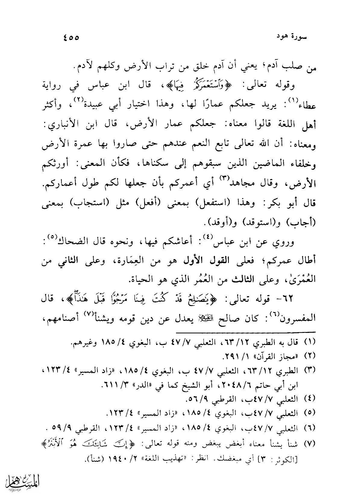 وقوله تعالى: {وَاسْتَعْمَرَكُمْ فِيهَا}، قال ابن عباس في رواية عطاء (¬1): يريد جعلكم عمارًا لها، وهذا اختيار أبي عبيدة (¬2)، وأكثر أهل اللغة قالوا معناه: جعلكم عمار الأرض، قال ابن الأنباري: ومعناه: أن الله تعالى تابع النعم عندهم حتى صاروا بها عمرة الأرض وخلفاء الماضين الذين سبقوهم إلى سكناها، فكأن المعنى: أورثكم الأرض، وقال مجاهد (¬3) أي أعمركم بأن جعلها لكم طول أعماركم. قال أبو بكر: وهذا (استفعل) بمعنى (أفعل) مثل (استجاب) بمعنى (أجاب) و (استو قد) و (أوقد).