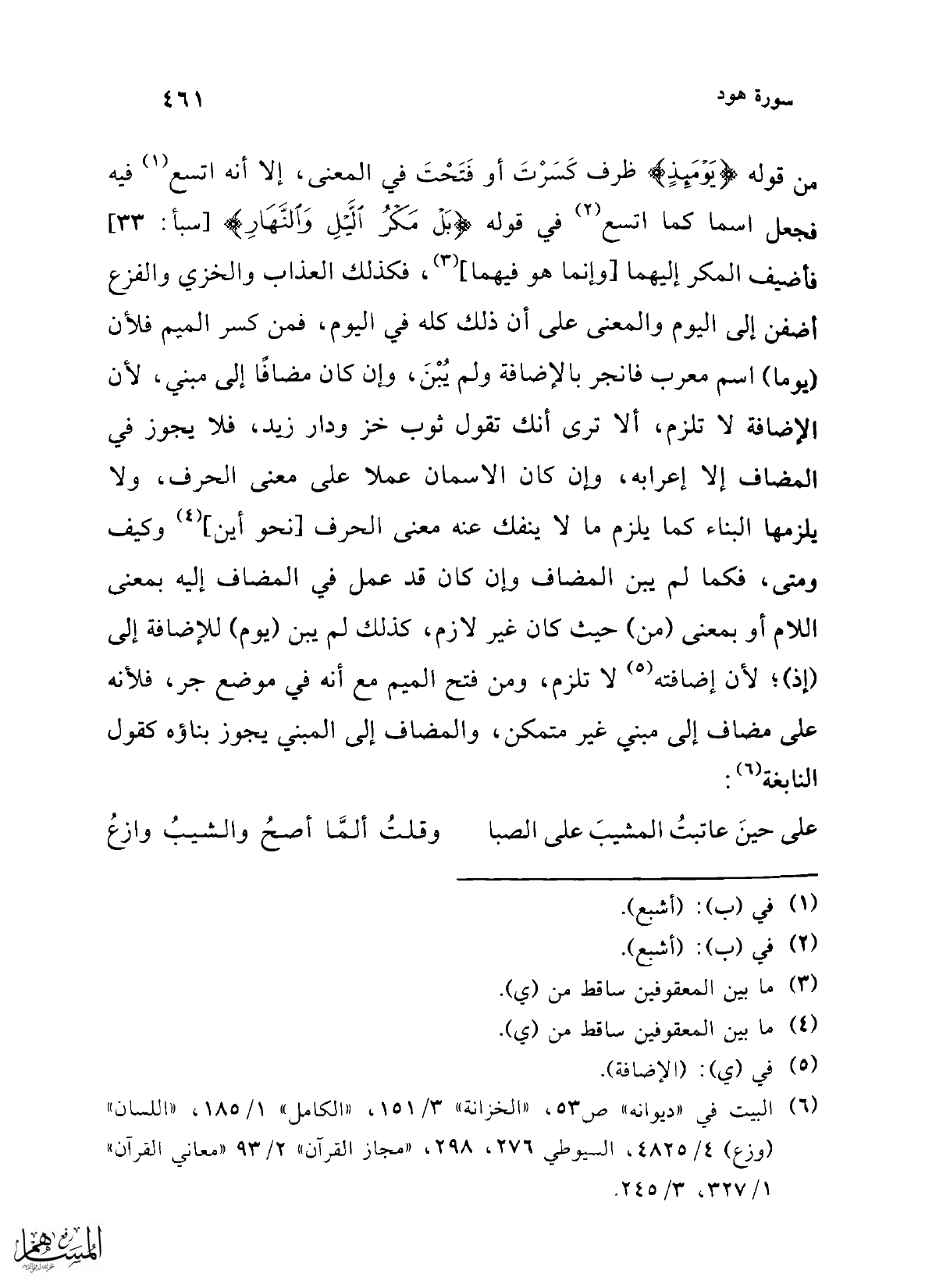 من قوله {يَوْمِئِذٍ} ظرف كَسَرْتَ أو فَتَحْتَ في المعنى، إلا أنه اتسع (¬1) فيه فجعل اسما كما اتسع (¬2) في قوله {بَلْ مَكْرُ اللَّيْلِ وَالنَّهَارِ} [سبأ: 33] فأضيف المكر إليهما [وإنما هو فيهما] (¬3)، فكذلك العذاب والخزي والفزع أضفن إلى اليوم والمعنى على أن ذلك كله في اليوم، فمن كسر الميم فلأن (يوما) اسم معرب فانجر با لإضافة ولم يُبْنَ، وإن كان مضافًا إلى مبني؛ لأن الأضافة لا تلزم، ألا ترى أنك تقول ثوب خز ودار زيد، فلا يجوز في المضاف إلا إعرابه، وإن كان الاسمان عملا على معنى الحرف، ولا يلزمها البناء كما يلزم ما لا ينفك عنه معنى الحرف [نحو أين] (¬4) وكيف ومتى، فكما لم يبن المضاف وإن كان قد عمل في المضاف إليه بمعنى اللام أو بمعنى (من) حيث كان غير لازم، كذلك لم يبن (يوم) للإضافة إلى (إذ)؛ لأن إضافته (¬5) لا تلزم، ومن فتح الميم مع أنه في موضع جر، فلأنه على مضاف إلى مبني غير متمكن، والمضاف إلى المبني يجوز بناؤه كقول النابغة (¬6):