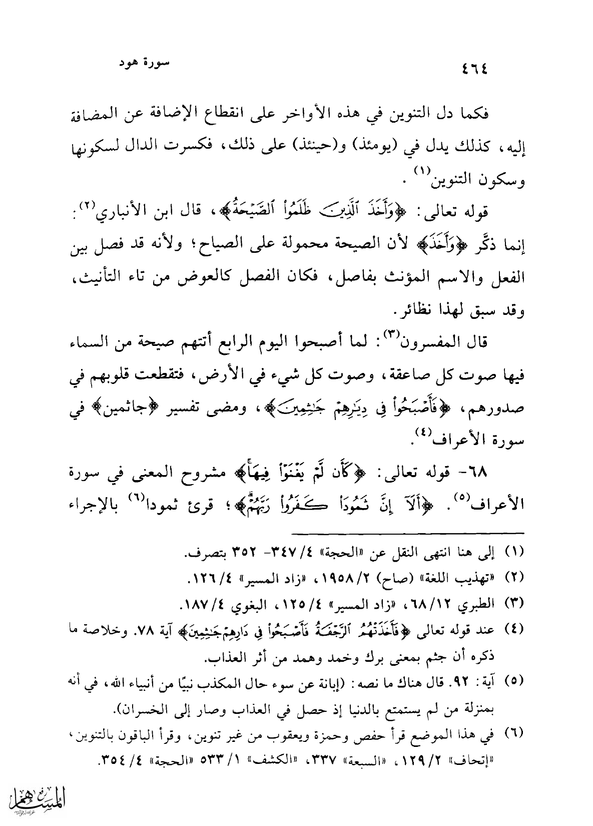 68 - قوله تعالى: {كَأَنْ لَمْ يَغْنَوْا فِيهَا} مشروح المعنى في سورة الأعراف (¬5). {أَلَا إِنَّ ثَمُودَ كَفَرُوا رَبَّهُمْ}؛ قرئ ثمودا (¬6) بالإجراء