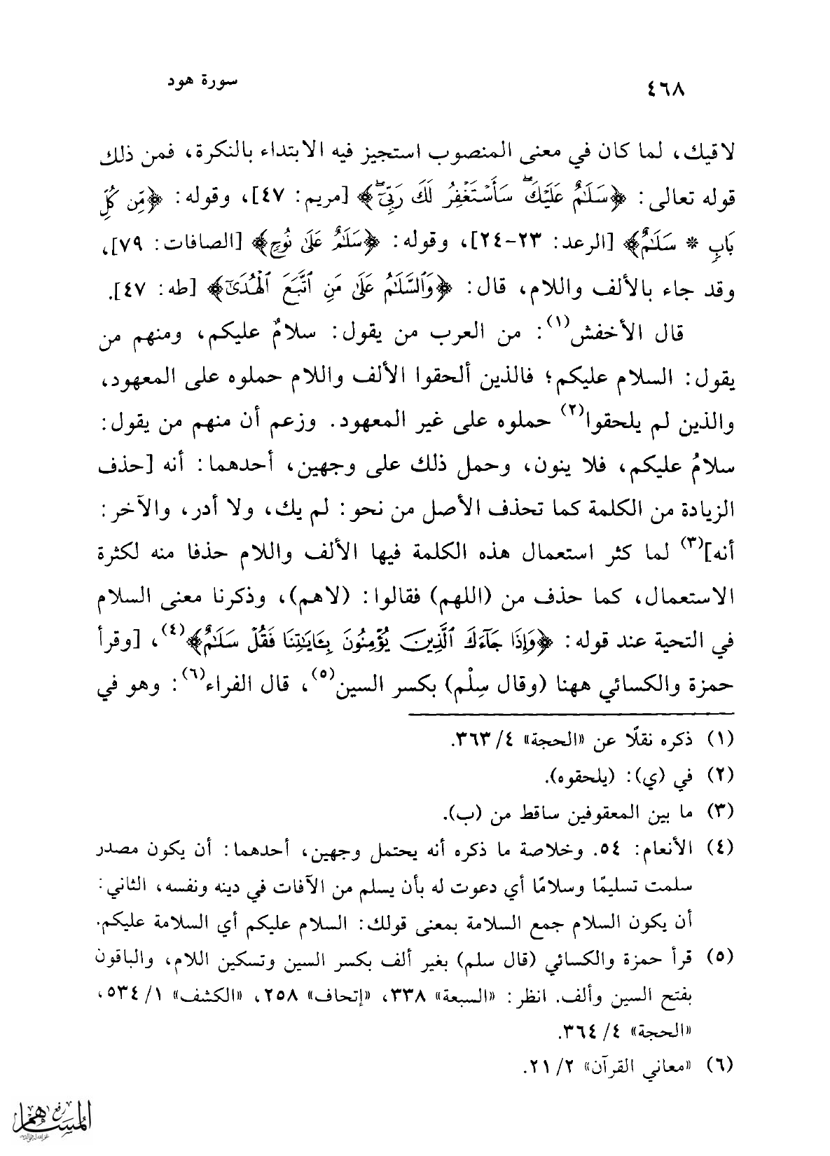 (¬4) الأنعام: 54. وخلاصة ما ذكره أنه يحتمل وجهن، أحدهما: أن يكون مصدر سلمت تسليمًا وسلامًا أي دعوت له بأن يسلم من الآفات في دينه ونفسه، الثاني: أن يكون السلام جمع السلامة بمعنى قولك: السلام عليكم أي السلامة عليكم.