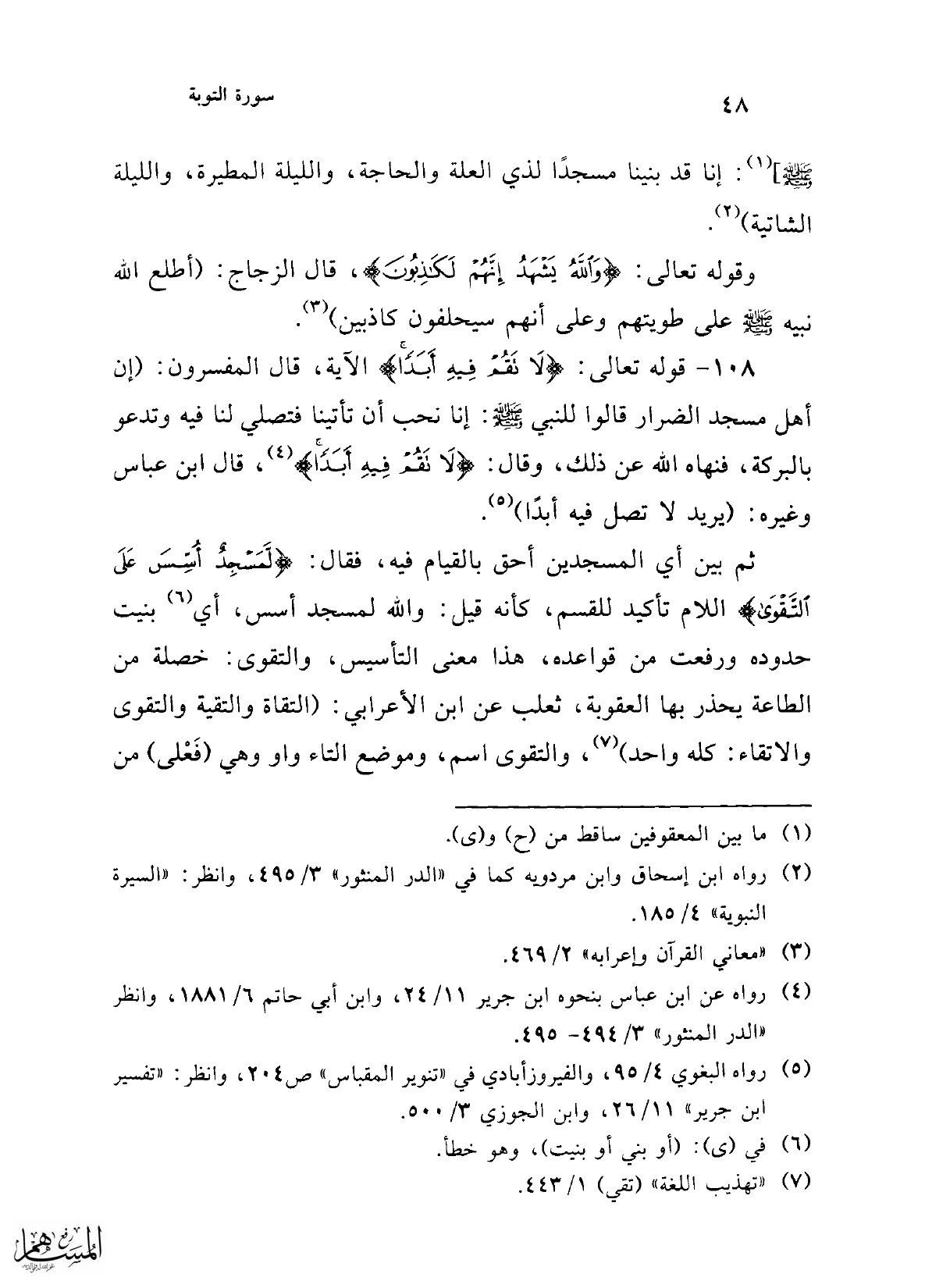 108 - قوله تعالى: {لَا تَقُمْ فِيهِ أَبَدًا} الآية، قال المفسرون: (إن أهل مسجد الضرار قالوا للنبي - صلى الله عليه وسلم -: إنا نحب أن تأتينا فتصلي لنا فيه وتدعو بالبركة، فنهاه الله عن ذلك، وقال: {لَا تَقُمْ فِيهِ أَبَدًا} (¬4)، قال ابن عباس وغيره: (يريد لا تصل فيه أبدًا) (¬5).