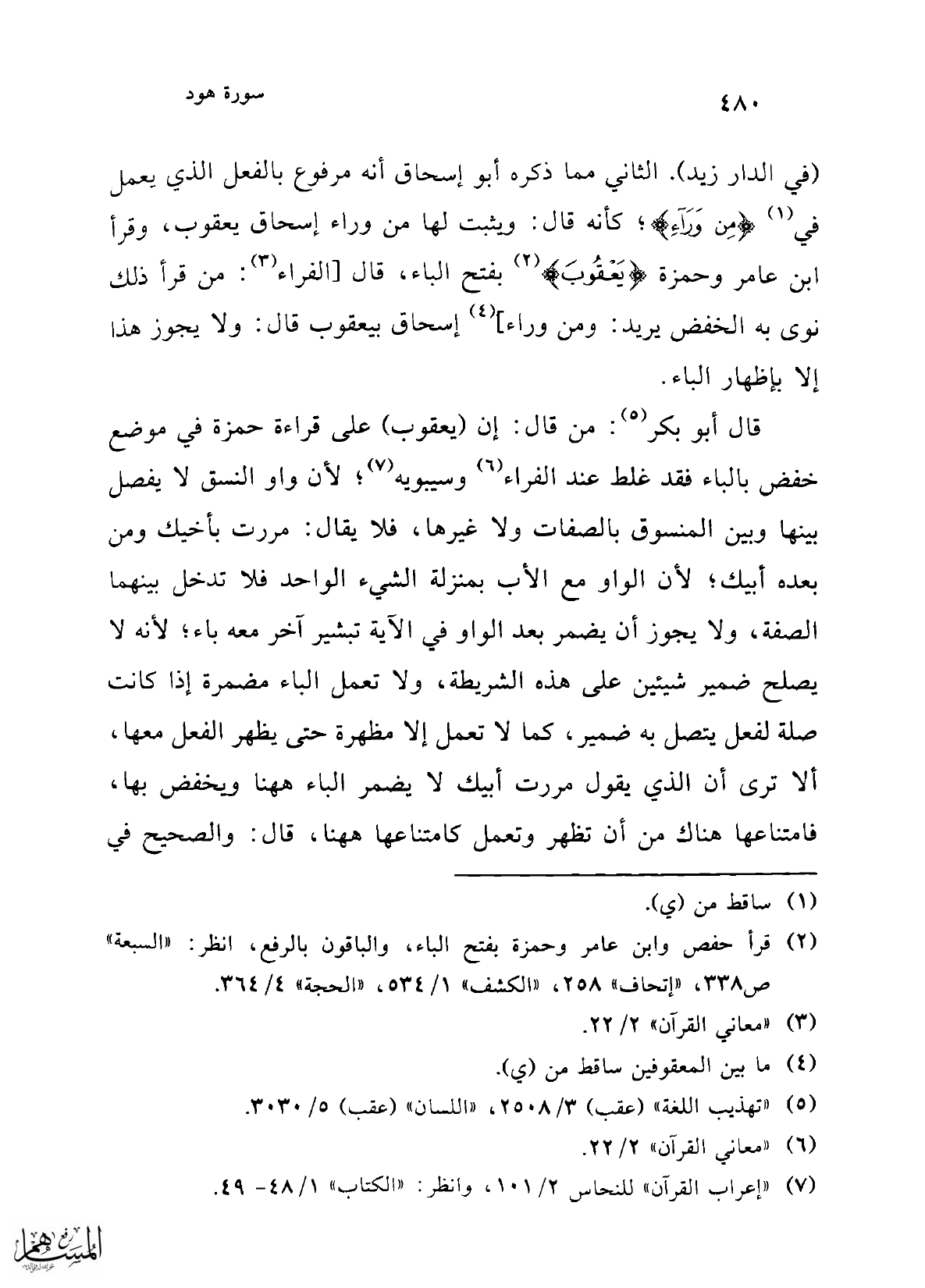 (في الدار زيد). الثاني مما ذكره أبو إسحاق أنه مرفوع بالفعل الذي يعمل في (¬1) {مِنْ وَرَاءِ}؛ كأنه قال: ويثبت لها من وراء إسحاق يعقوب، وقرأ ابن عامر وحمزة {يَعْقُوبَ} (¬2) بفتح الباء، قال [الفراء (¬3): من قرأ ذلك نوى به الخفض يريد: ومن وراء] (¬4) إسحاق بيعقوب قال: ولايجوز هذا إلا بإظهار الباء.