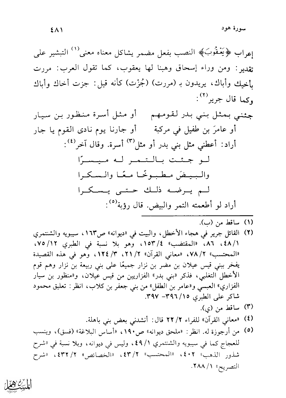 إعراب {يَعْقُوبَ} النصب بفعل مضمر يشاكل معناه معنى (¬1) التبشير على تقدير: ومن وراء إسحاق وهبنا لها يعقوب، كما تقول العرب: مررت بأخيك وأباك، يريدون بـ (مررت) (جُزْت) كأنه قيل: جزت أخاك وأباك وكما قال جرير (¬2):