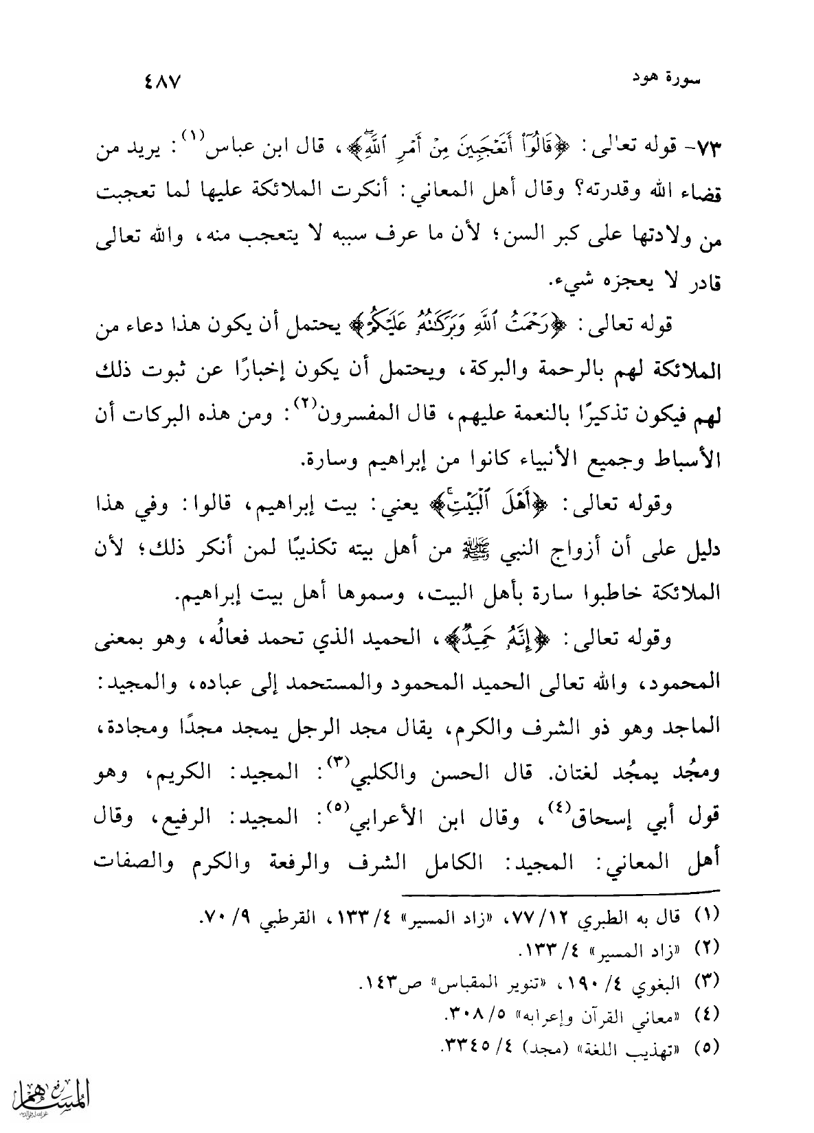 73 - قوله تعالى: {قَالُوا أَتَعْجَبِينَ مِنْ أَمْرِ اللَّهِ}، قال ابن عباس (¬1): يريد من قضاء الله وقدرته؟ وقال أهل المعاني: أنكرت الملائكة عليها لما تعجبت من ولادتها على كبر السن؛ لأن ما عرف سببه لا يتعجب منه، والله تعالى قادر لا يعجزه شيء.