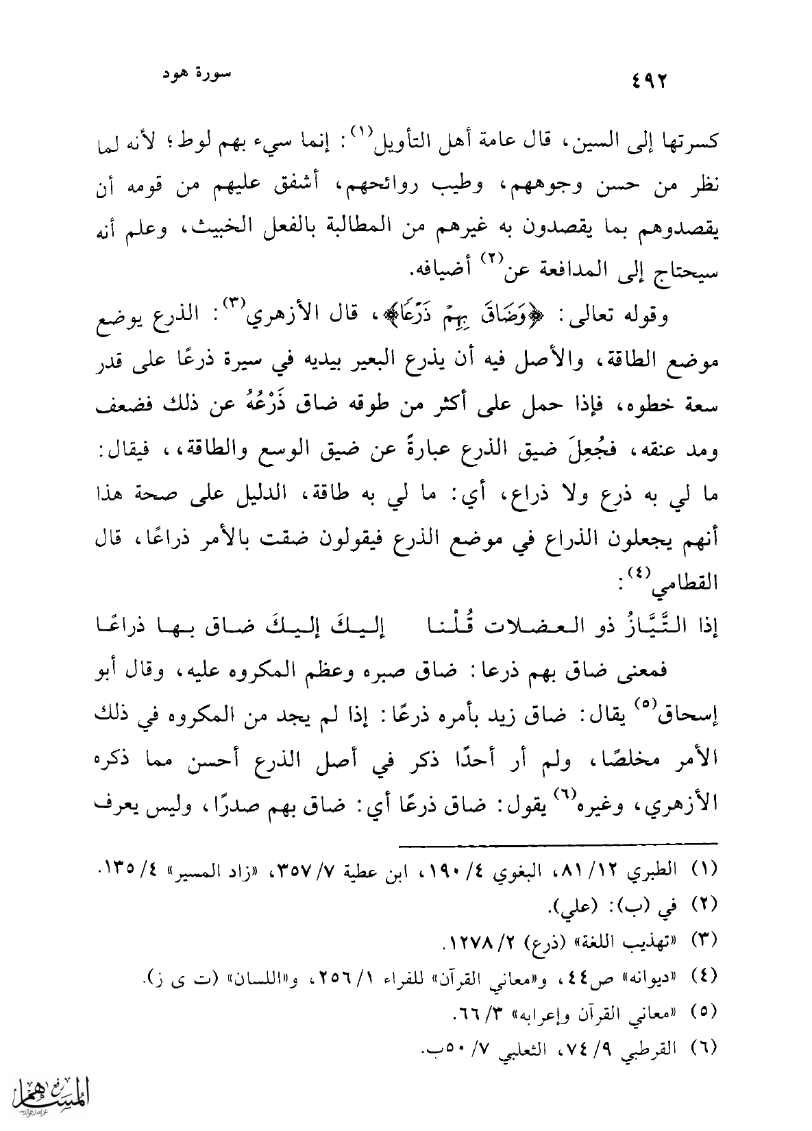 وقوله تعالى: {وَضَاقَ بِهِمْ ذَرْعًا}، قال الأزهري (¬3): الذرع يوضع موضع الطاقة، والأصل فيه أن يذرع البعير بيديه في سيرة ذرعًا على قدر سعة خطوه، فإذا حمل على أكثر من طوقه ضاق ذَرْعُهُ عن ذلك فضعف ومد عنقه، فجُعِلَ ضيق الذرع عبارةً عن ضيق الوسع والطاقة،، فيقال: ما لي به ذرع ولا ذراع، أي: ما لي به طاقة، الدليل على صحة هذا أنهم يجعلون الذراع في موضع الذرع فيقولون ضقت بالأمر ذراعًا، قال القطامي (¬4):