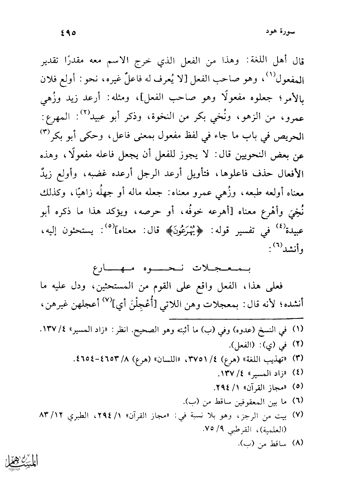 قال أهل اللغة: وهذا من الفعل الذي خرج الاسم معه مقدرًا تقدير المفعول (¬1)، وهو صاحب الفعل [لا يُعرف له فاعلٌ غيره، نحو: أولع فلان بالأمر؛ جعلوه مفعولًا وهو صاحب الفعل]، ومثله: أرعد زيد وزُهي عمرو، من الزهو، ونُخي بكر من النخوة، وذكر أبو عبيد (¬2): المهرع: الحريص في باب ما جاء في لفظ مفعول بمعنى فاعل، وحكى أبو بكر (¬3) عن بعض النحويين قال: لا يجوز للفعل أن يجعل فاعله مفعولًا، وهذه الأفعال حذف فاعلوها، فتأويل أرعد الرجل أرعده غضبه، وأولع زيدٌ معناه أولعه طبعه، وزُهي عمرو معناه: جعله ماله أو جهلُه زاهيًا، وكذلك نُخِيَ وأهْرع معناه [أهرعه خوفُه، أو حرصه، ويؤكد هذا ما ذكره أبو عبيدة (¬4) في تفسير قوله: {يُهْرَعُونَ} قال: معناه] (¬5): يستحثون إليه، وأنشد (¬6):