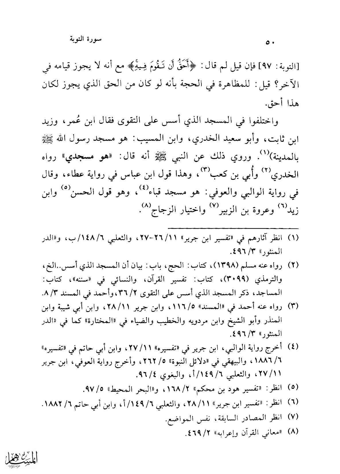 (¬2) رواه عنه مسلم (1398)، كتاب: الحج، باب: بيان أن المسجد الذي أسس .. إلخ، والترمذي (3599)، كتاب: تفسير القرآن، والنسائي في "سننه"، كتاب: المساجد، ذكر المسجد الذي أسس على التقوى 2/ 36، وأحمد في المسند 3/ 8.