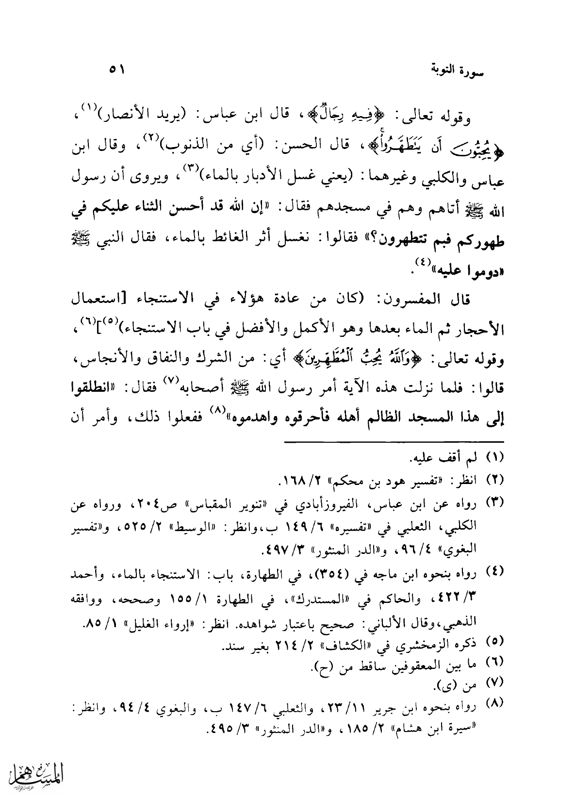 قال المفسرون: (كان من عادة هؤلاء في الاستنجاء [استعمال الأحجار ثم الماء بعدها وهو الأكمل والأفضل في باب الاستنجاء) (¬5)] (¬6)، وقوله تعالى: {وَاللَّهُ يُحِبُّ الْمُطَّهِّرِينَ} أي: من الشرك والنفاق والأنجاس، قالوا: فلما نزلت هذه الآية أمر رسول الله - صلى الله عليه وسلم - أصحابه (¬7) فقال: "انطلقوا إلى هذا المسجد الظالم أهله فأحرقوه واهدموه" (¬8) ففعلوا ذلك، وأمر أن