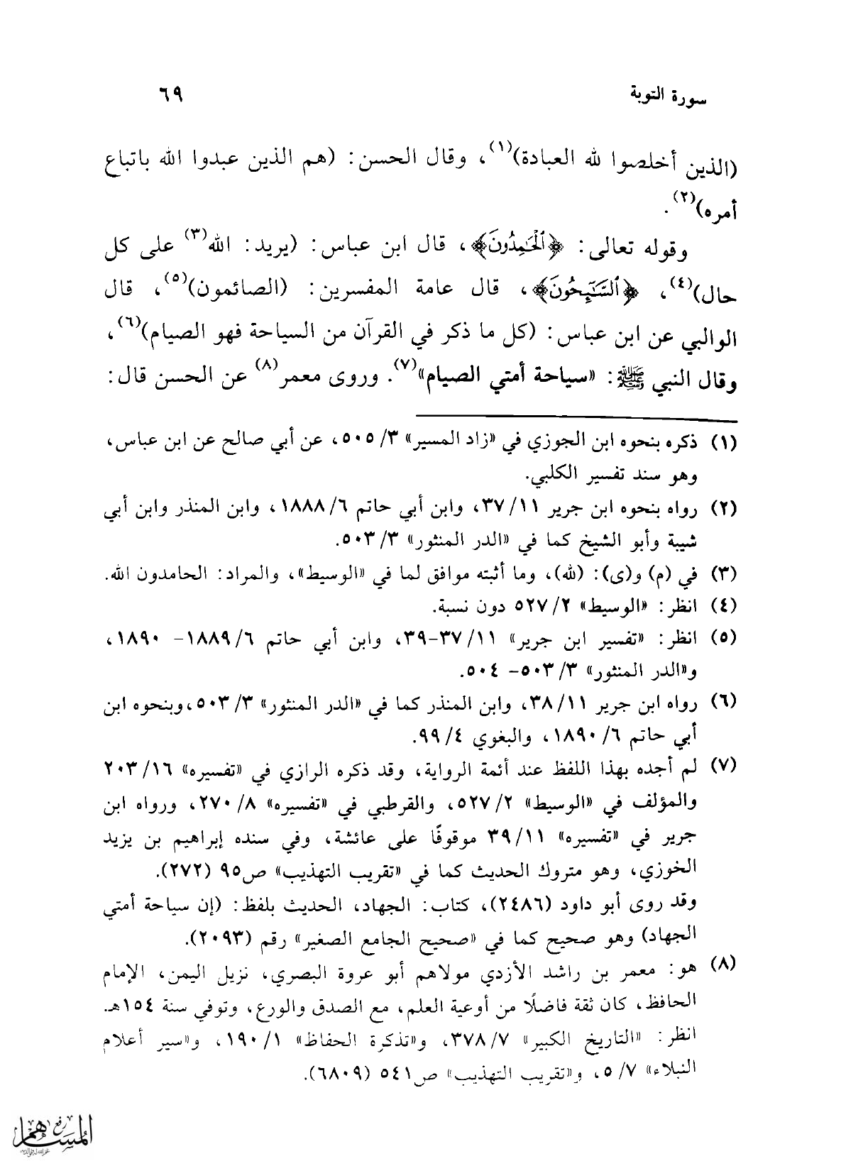 وقوله تعالى: {الْحَامِدُونَ}، قال ابن عباس: (يريد: الله (¬3) على كل حال) (¬4)، {السَّائِحُونَ}، قال عامة المفسرين: (الصائمون) (¬5)، قال الوالبي عن ابن عباس: (كل ما ذكر في القرآن من السياحة فهو الصيام) (¬6)، وقال النبي -صلى الله عليه وسلم-: "سياحة أمتي الصيام" (¬7). وروى معمر (¬8) عن الحسن قال:
