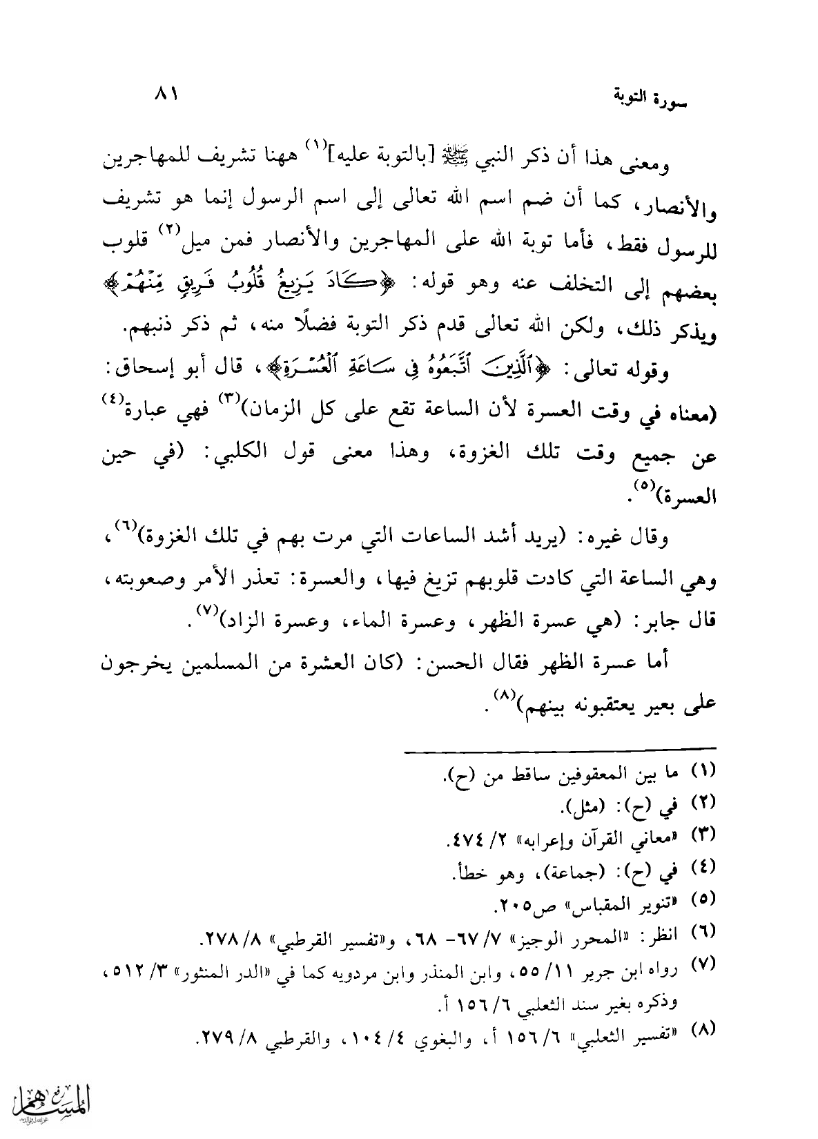 وقال غيره: (يريد أشد الساعات التي مرت بهم في تلك الغزوة) (¬6)، وهي الساعة التي كادت قلوبهم تزيغ فيها، والعسرة: تعذر الأمر وصعوبته، قال جابر: (هي عسرة الظهر، وعسرة الماء، وعسرة الزاد) (¬7).