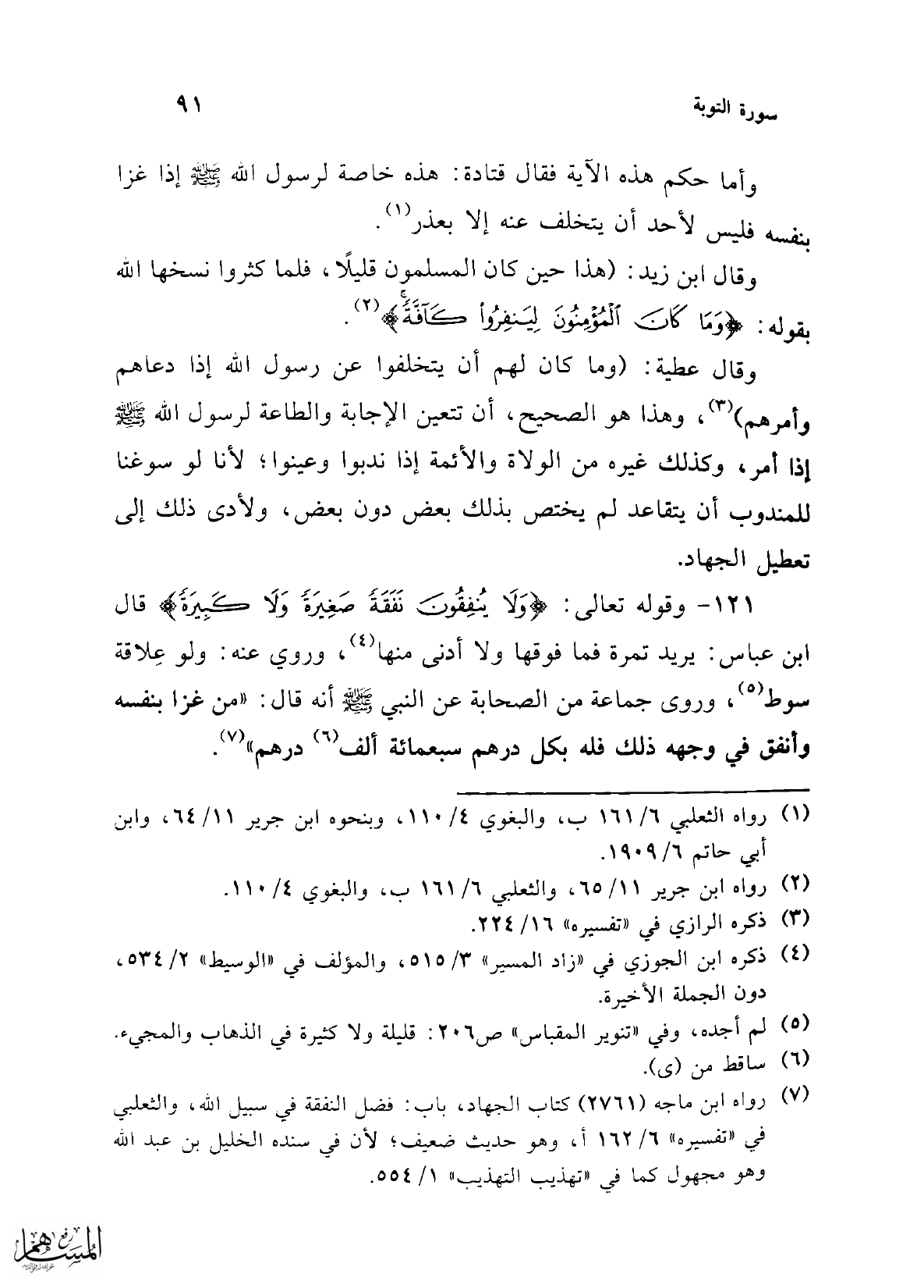 وقال ابن زيد: (هذا حين كان المسلمون قليلاً، فلما كثروا نسخها الله بقوله: {وَمَا كَانَ الْمُؤْمِنُونَ لِيَنْفِرُوا كَافَّةً} (¬2).