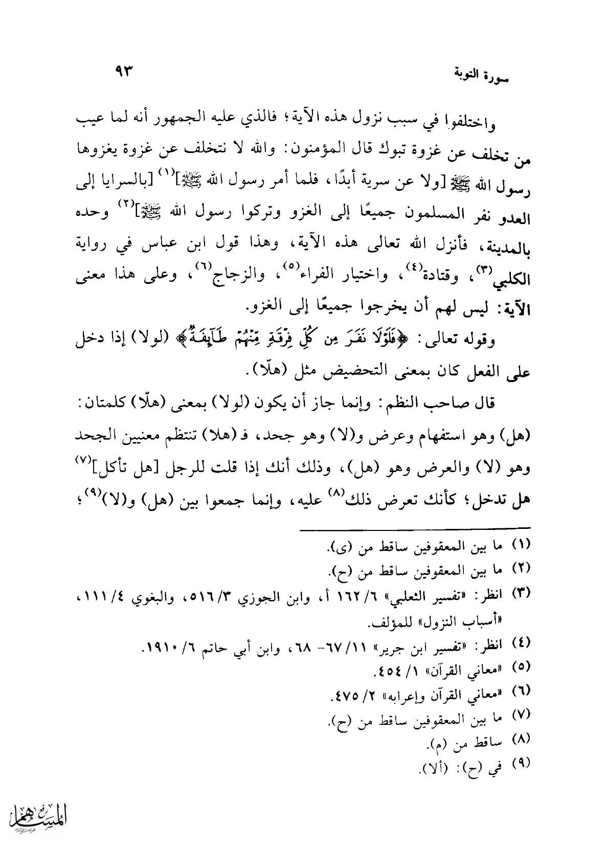 وقوله تعالى: {فَلَوْلَا نَفَرَ مِنْ كُلِّ فِرْقَةٍ مِنْهُمْ طَائِفَةٌ} (لولا) إذا دخل على الفعل كان بمعنى التحضيض مثل (هلّا).