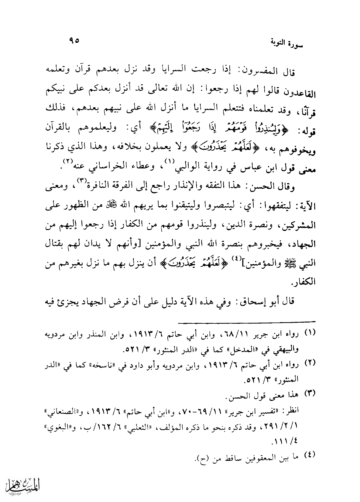 وقال الحسن: هذا التفقه والإنذار راجع إلى الفرقة النافرة (¬3)، ومعنى الآية: ليتفقهوا: أي: ليتبصروا وليتيقنوا بما يريهم الله -عز وجل- من الظهور على المشركين، ونصرة الدين، ولينذروا قومهم من الكفار إذا رجعوا إليهم من الجهاد، فيخبروهم بنصرة الله النبي والمؤمنين [وأنهم لا يدان لهم بقتال النبي - صلى الله عليه وسلم - والمؤمنين] (¬4) {لَعَلَّهُمْ يَحْذَرُونَ} أن ينزل بهم ما نزل بغيرهم من الكفار.