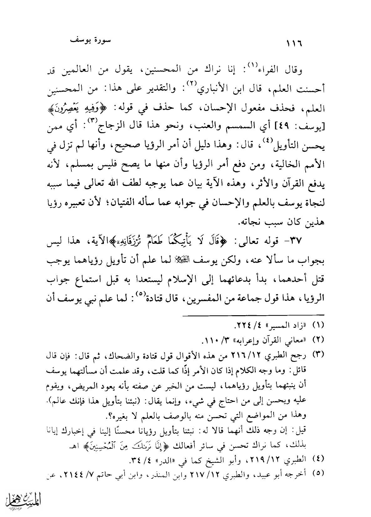 (¬4) رجح الطبري 12/ 216 من هذه الأقوال قول قتادة والضحاك، ثم قال: فإن قال قائل: وما وجه الكلام إذا كان الأمر إذاً كما قلت، وقد علمت أن مسألتهما يوسف أن ينبئهما بتأويل رؤياهما، ليست من الخبر عن صفته بأنه يعود المريض، ويقوم عليه ويحسن إلى من احتاج في شيء، وإنما يقال: (نبئنا بتأويل هذا فإنك عالم). وهذا من المواضع التي تحسن منه بالوصف بالعلم لا بغيره؟.