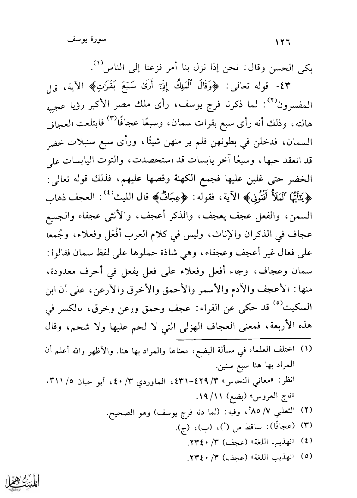 43 - قوله تعالى: {وَقَالَ الْمَلِكُ إِنِّي أَرَى سَبْعَ بَقَرَاتٍ} الآية، قال المفسرون (¬2): لما ذكرنا فرج يوسف، رأى ملك مصر الأكبر رؤيا عجيبة هالته، وذلك أنه رأى سبع بقرات سمان، وسبعًا عجافًا (¬3) فابتلعت العجاف السمان، فدخلن في بطونهن فلم ير منهن شيئًا، ورأى سبع سنبلات خضر قد انعقد حبها، وسبعًا آخر يابسات قد استحصدت، والتوت اليابسات على الخضر حتى غلبن عليها فجمع الكهنة وقصها عليهم، فذلك قوله تعالى: {يَا أَيُّهَا الْمَلَأُ أَفْتُونِي} الآية، فقوله: {عِجَافٌ} قال الليث (¬4): العجف ذهاب السمن، والفعل عجف يعجف، والذكر أعجف، والأنثى عجفاء والجميع عجاف في الذكران والإناث، وليس في كلام العرب أفْعَل وفعلاء، وجُمعا على فعال غير أعجف وعجفاء، وهي شاذة حملوها على لفظ سمان فقالوا: سمان وعجاف، وجاء أفعل وفعلاء على فعل يفعل في أحرف معدودة، منها: الأعجف والآدم والأسمر والأحمق والأخرق والأرعن، على أن ابن السكيت (¬5) قد حكى عن الفراء: عجف وحمق ورعن وخرق، بالكسر في هذه الأربعة، فمعنى العجاف الهزلى التي لا لحم عليها ولا شحم، وقال