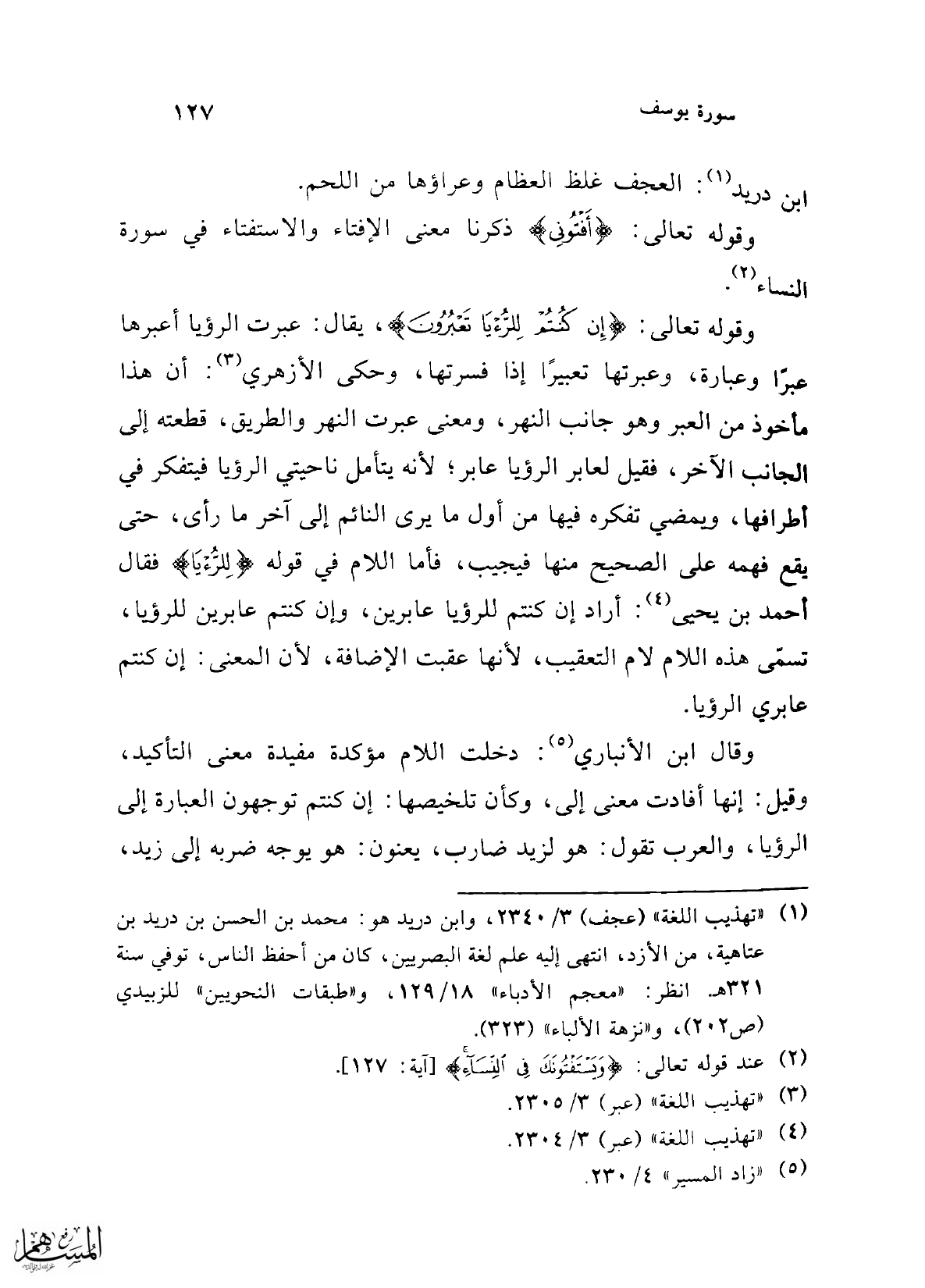 وقوله تعالى: {إِنْ كُنْتُمْ لِلرُّؤْيَا تَعْبُرُونَ}، يقال: عبرت الرؤيا أعبرها عبرًا وعبارة، وعبرتها تعبيرًا إذا فسرتها، وحكى الأزهري (¬3): أن هذا مأخوذ من العبر وهو جانب النهر، ومعنى عبرت النهر والطريق، قطعته إلى الجانب الآخر، فقيل لعابر الرؤيا عابر؛ لأنه يتأمل ناحيتي الرؤيا فيتفكر في أطرافها، ويمضي تفكره فيها من أول ما يرى النائم إلى آخر ما رأى، حتى يقع فهمه على الصحيح منها فيجيب، فأما اللام في قوله {لِلرُّؤْيَا} فقال أحمد بن يحيى (¬4): أراد إن كنتم للرؤيا عابرين، وإن كنتم عابرين للرؤيا، تسمّى هذه اللام لام التعقيب، لأنها عقبت الإضافة، لأن المعنى: إن كنتم عابري الرؤيا.