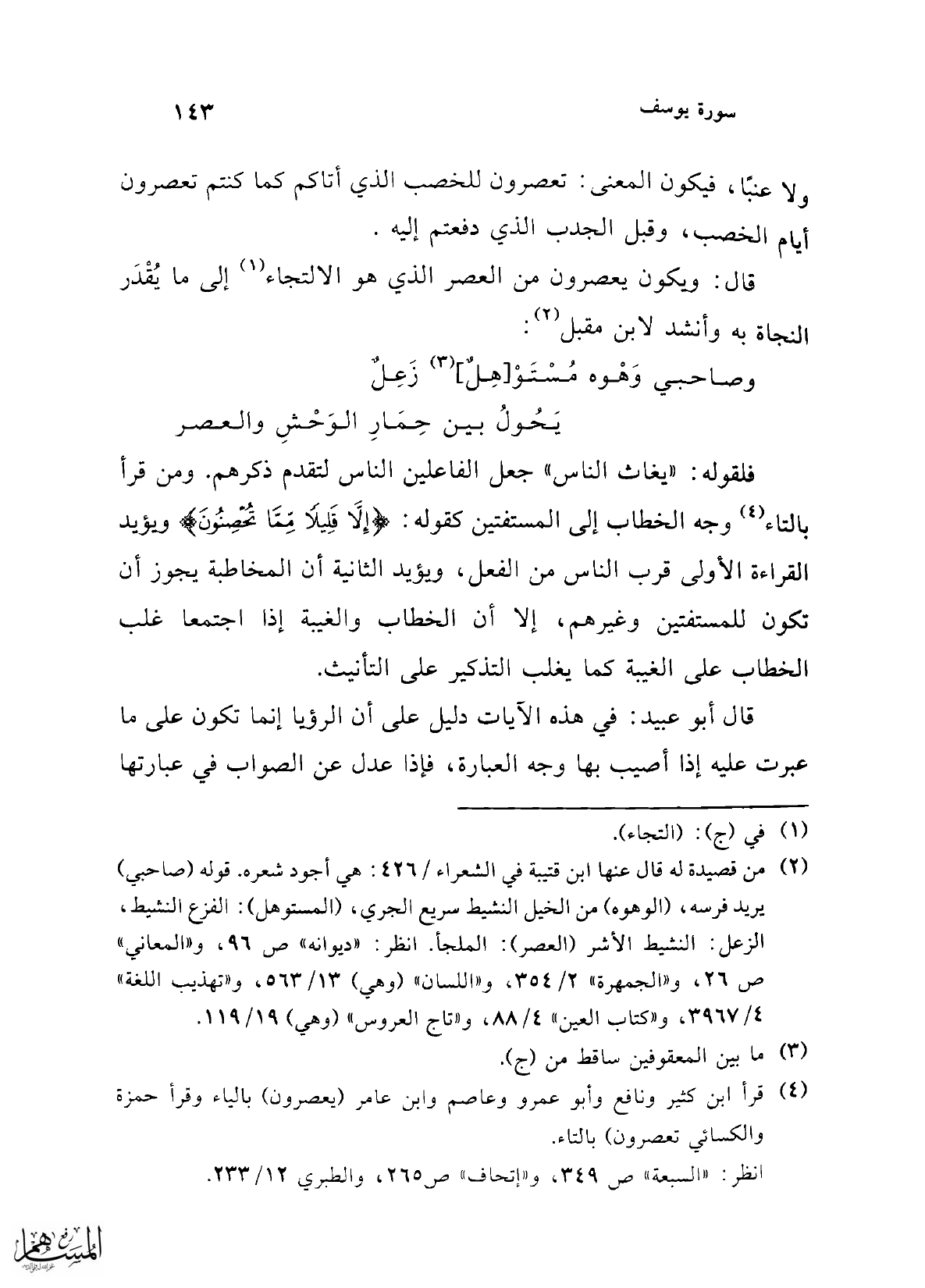 (¬4) قرأ ابن كثير ونافع وأبو عمرو وعاصم وابن عامر (يعصرون) بالياء وقرأ حمزة والكسائي تعصرون) بالتاء.
