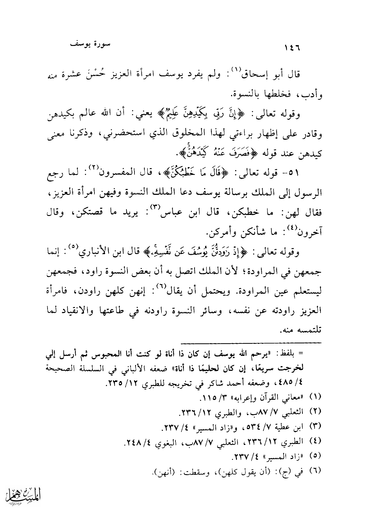 = بلفظ: "يرحم الله يوسف إن كان ذا أناة لو كنت أنا المحبوس ثم أرسل إلى لخرجت سريعًا، إن كان لحليمًا ذا أناة" ضعفه الألباني في السلسلة الصحيحة 4/ 485، وضعفه أحمد شاكر في تخريجه للطبري 12/ 235.