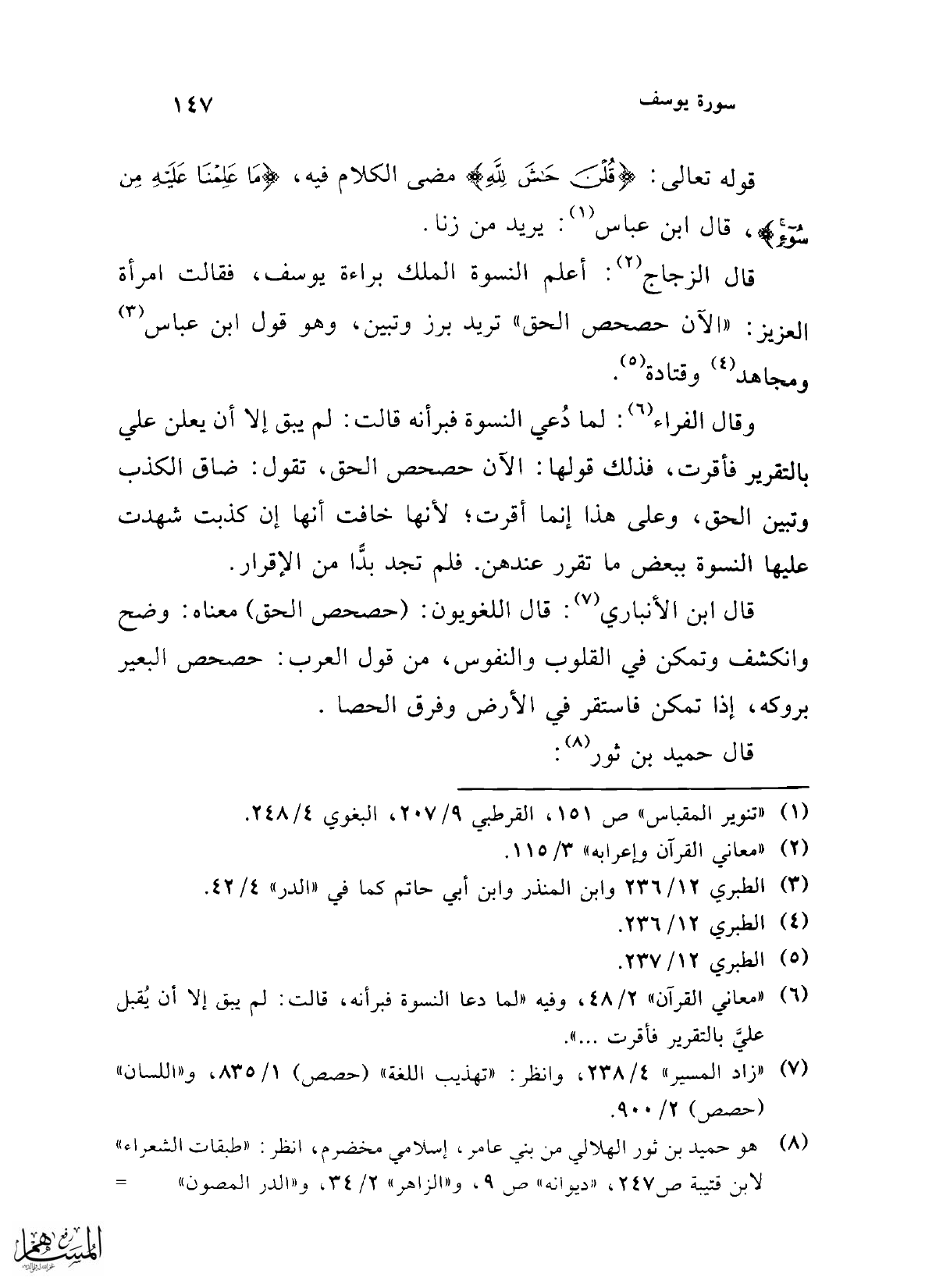 (¬6) "معاني القرآن" 2/ 48، وفيه "لما دعا النسوة فبرأنه، قالت: لم يبق إلا أن يُقبل عليَّ بالتقرير فأقرت ... ".