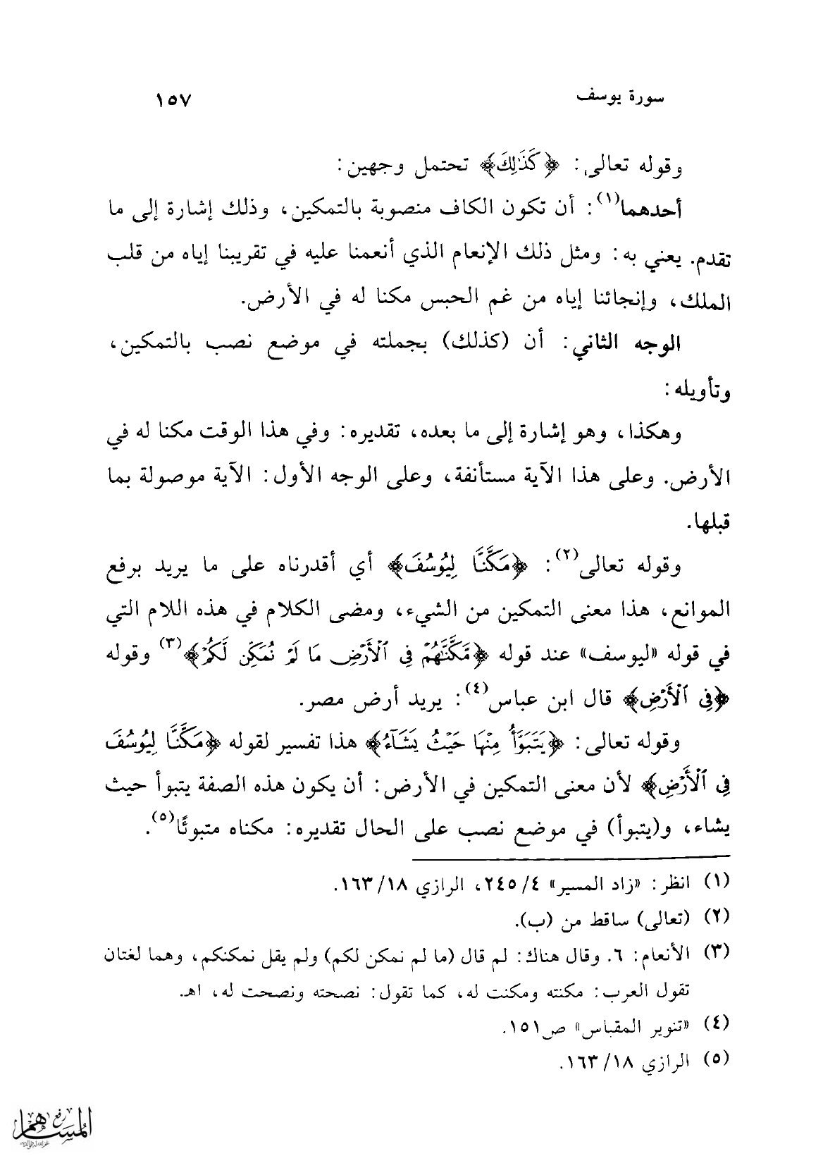 وقوله تعالى: {يَتَبَوَّأُ مِنْهَا حَيْثُ يَشَاءُ} هذا تفسير لقوله {مَكَّنَّا لِيُوسُفَ فِي الْأَرْضِ} لأن معنى التمكين في الأرض: أن يكون هذه الصفة يتبوأ حيث يشاء، و (يتبوأ) في موضع نصب على الحال تقديره: مكناه متبوئًا (¬5).