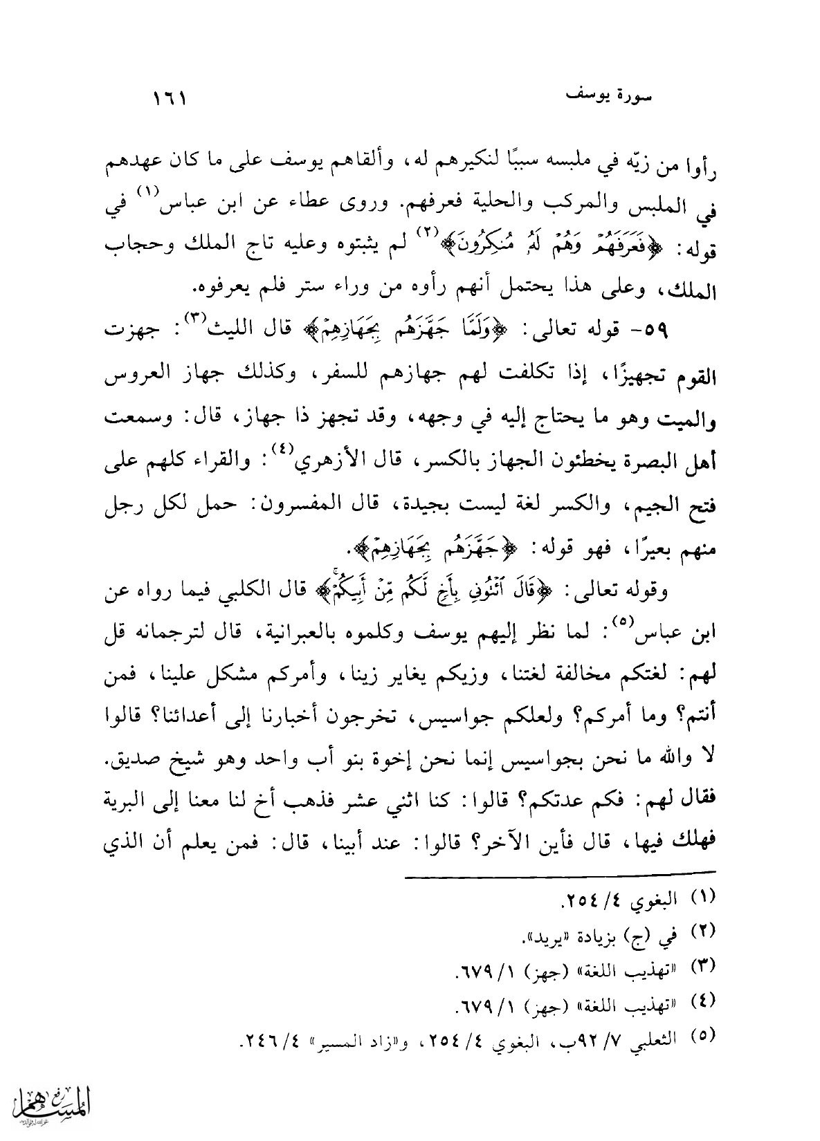 59 - قوله تعالى: {وَلَمَّا جَهَّزَهُمْ بِجَهَازِهِمْ} قال الليث (¬3): جهزت القوم تجهيزًا، إذا تكلفت لهم جهازهم للسفر، وكذلك جهاز العروس والميت وهو ما يحتاج إليه في وجهه، وقد تجهز ذا جهاز، قال: وسمعت أهل البصرة يخطئون الجهاز بالكسر، قال الأزهري (¬4): والقراء كلهم على فتح الجيم، والكسر لغة ليست بجيدة، قال المفسرون: حمل لكل رجل منهم بعيرًا، فهو قوله: {جَهَّزَهُمْ بِجَهَازِهِمْ}.