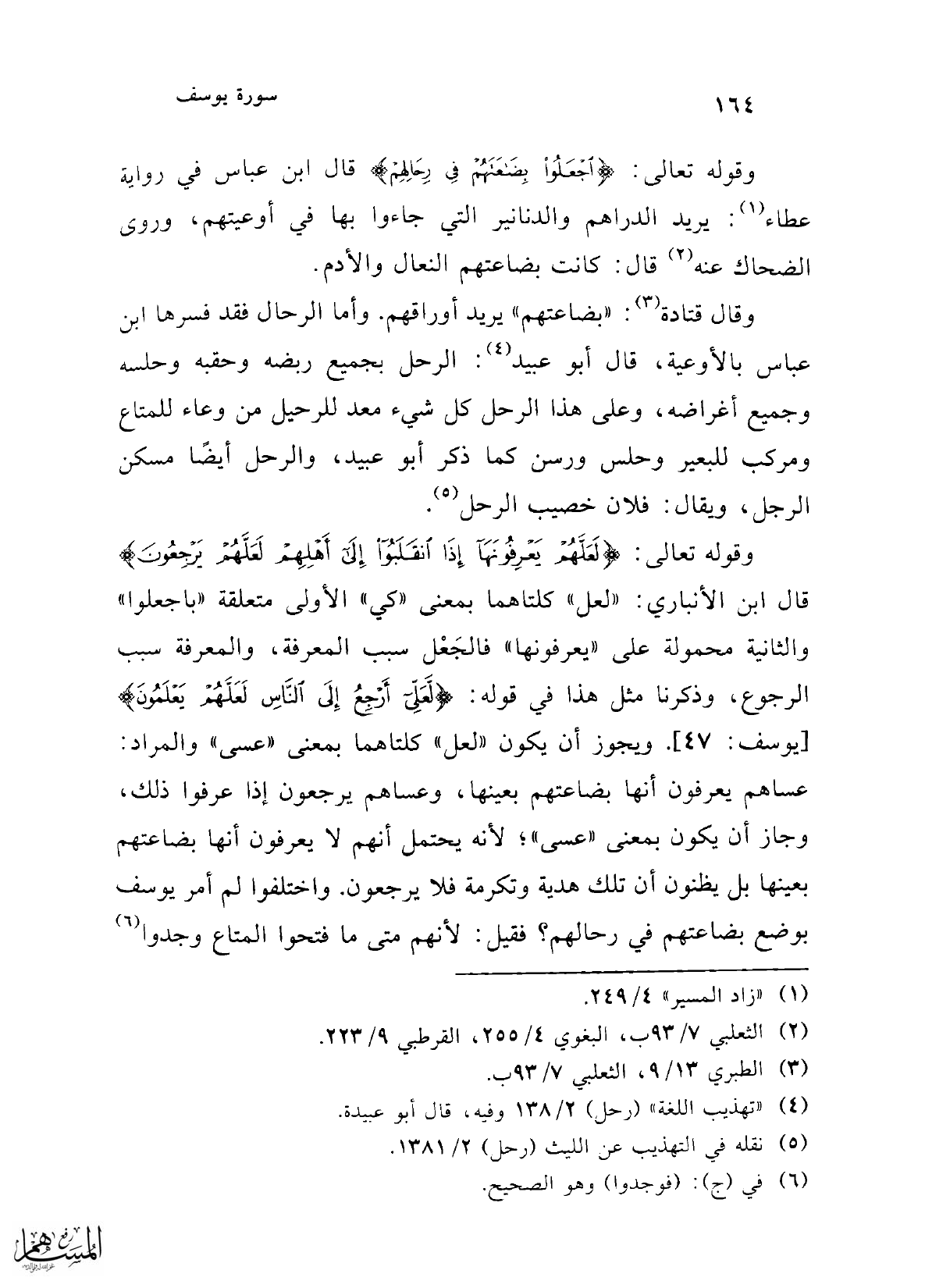 وقوله تعالى: {لَعَلَّهُمْ يَعْرِفُونَهَا إِذَا انْقَلَبُوا إِلَى أَهْلِهِمْ لَعَلَّهُمْ يَرْجِعُونَ} قال ابن الأنباري: "لعل" كلتاهما بمعنى "كي" الأولى متعلقة "باجعلوا" والثانية محمولة على "يعرفونها" فالجَعْل سبب المعرفة، والمعرفة سبب الرجوع، وذكرنا مثل هذا في قوله: {لَعَلِّي أَرْجِعُ إِلَى النَّاسِ لَعَلَّهُمْ يَعْلَمُونَ} [يوسف: 46]. ويجوز أن يكون "لعل" كلتاهما بمعنى "عسى" والمراد: عساهم يعرفون أنها بضاعتهم بعينها، وعساهم يرجعون إذا عرفوا ذلك، وجاز أن يكون بمعنى "عسى"؛ لأنه يحتمل أنهم لا يعرفون أنها بضاعتهم بعينها بل يظنون أن تلك هدية وتكرمة فلا يرجعون. واختلفوا لم أمر يوسف بوضع بضاعتهم في رحالهم؟ فقيل: لأنهم متى ما فتحوا المتاع وجدوا (¬6)