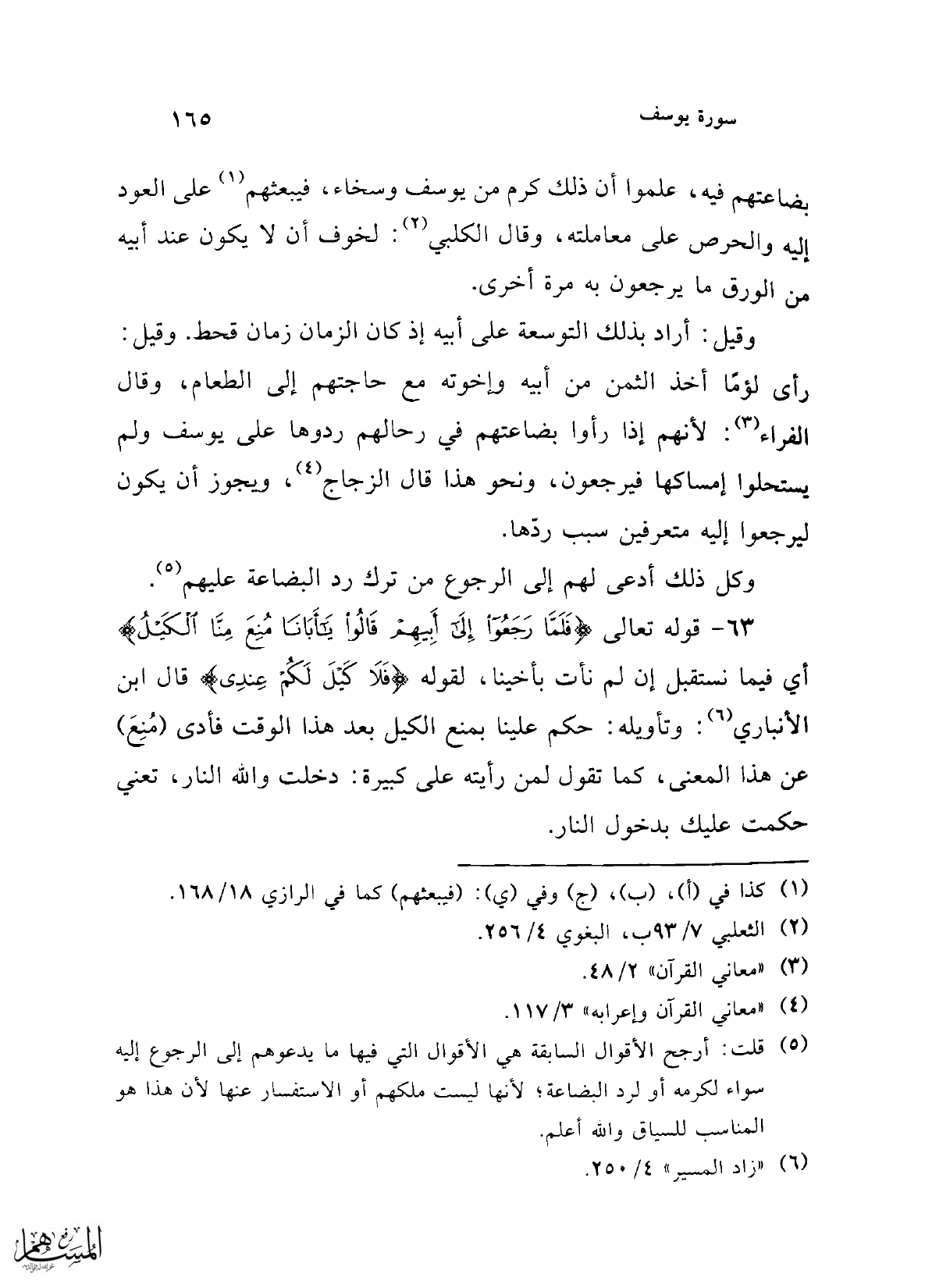 (¬5) قلت: أرجح الأقوال السابقة هي الأقوال التي فيها ما يدعوهم إلى الرجوع إليه سواء لكرمه أو لرد البضاعة؛ لأنها ليست ملكهم أو الاستفار عنها لأن هذا هو المناسب للسياق والله أعلم.