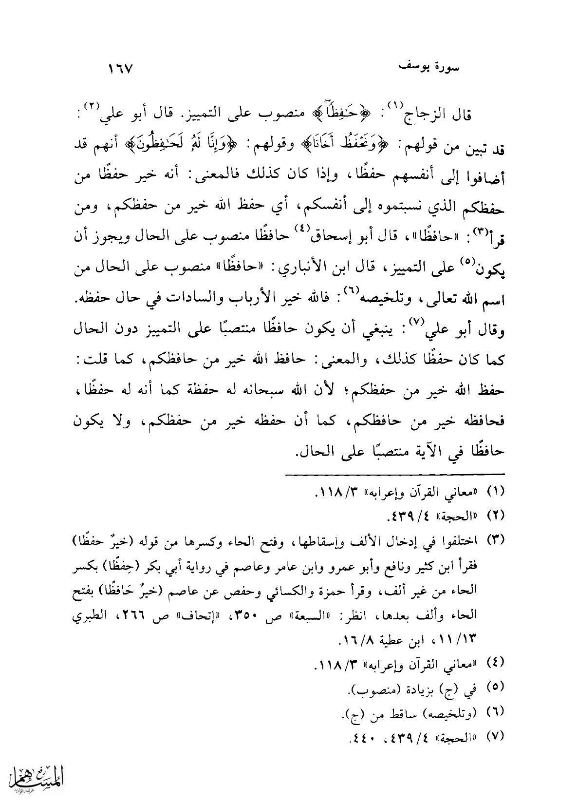 (¬3) اختلفوا في إدخال الألف وإسقاطها، وفتح الحاء وكسرها من قوله (خيرٌ حفظًا) فقرأ ابن كثير ونافع وأبو عمرو وابن عامر وعاصم في رواية أبي بكر (حِفظًا) بكسر الحاء من غير ألف، وقرأ حمزة والكسائي وحفص عن عاصم (خيرٌ حَافظًا) بفتح الحاء وألف بعدها، انظر: "السبعة" ص 350، "إتحاف" ص 266، الطبري 13/ 11، ابن عطية 8/ 16.