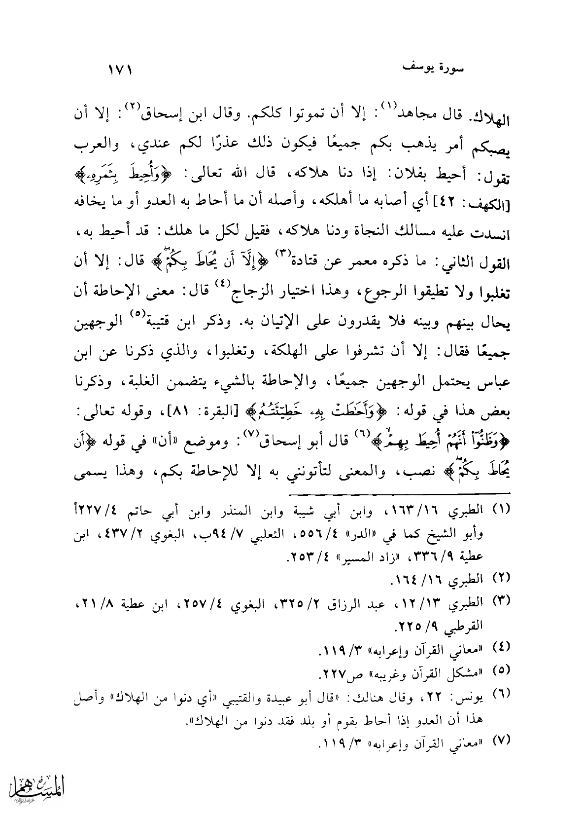 الهلاك. قال مجاهد (¬1): إلا أن تموتوا كلكم. وقال ابن إسحاق (¬2): إلا أن يصبكم أمر يذهب بكم جميعًا فيكون ذلك عذرًا لكم عندي، والعرب تقول: أحيط بفلان: إذا دنا هلاكه، قال الله تعالى: {وَأُحِيطَ بِثَمَرِهِ} [الكهف: 42] أي أصابه ما أهلكه، وأصله أن ما أحاط به العدو أو ما يخافه انسدت عليه مسالك النجاة ودنا هلاكه، فقيل لكل ما هلك: قد أحيط به، القول الثاني: ما ذكره معمر عن قتادة (¬3) {إِلَّا أَنْ يُحَاطَ بِكُمْ} قال: إلا أن تغلبوا ولا تطيقوا الرجوع، وهذا اختيار الزجاج (¬4) قال: معنى الإحاطة أن يحال بينهم وبينه فلا يقدرون على الإتيان به. وذكر ابن قتيبة (¬5) الوجهين جميعًا فقال: إلا أن تشرفوا على الهلكة، وتغلبوا، والذي ذكرنا عن ابن عباس يحتمل الوجهين جميعًا، والإحاطة بالشيء يتضمن الغلبة، وذكرنا بعض هذا في قوله: {وَأَحَاطَتْ بِهِ خَطِيئَتُهُ} [البقرة: 81]، وقوله تعالى: {وَظَنُّوا أَنَّهُمْ أُحِيطَ بِهِمْ} (¬6) قال أبو إسحاق (¬7): وموضع "أن" في قوله {أَنْ يُحَاطَ بِكُمْ} نصب، والمعنى لتأتونني به إلا للإحاطة بكم، وهذا يسمى