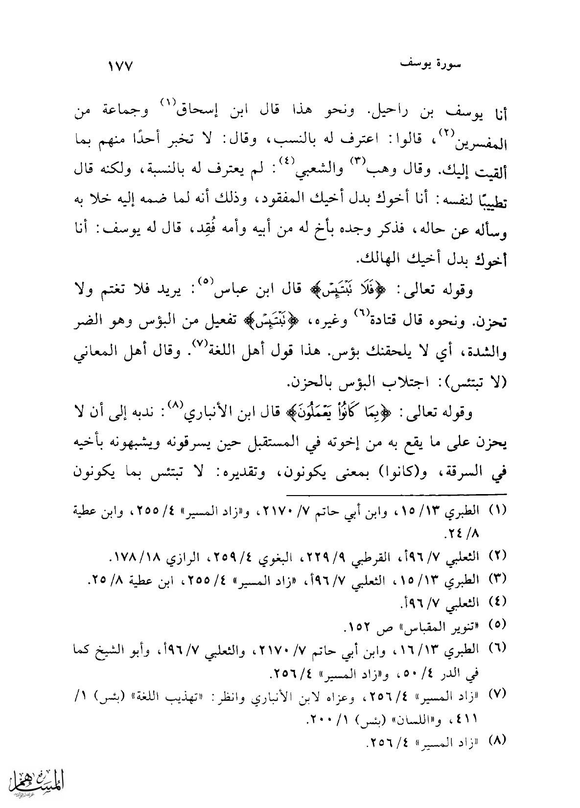 أنا يوسف بن راحيل. ونحو هذا قال ابن إسحاق (¬1) وجماعة من المفسرين (¬2)، قالوا: اعترف له بالنسب، وقال: لا تخبر أحدًا منهم بما ألقيت إليك. وقال وهب (¬3) والشعبي (¬4): لم يعترف له بالنسبة، ولكنه قال تطييبًا لنفسه: أنا أخوك بدل أخيك المفقود، وذلك أنه لما ضمه إليه خلا به وسأله عن حاله، فذكر وجده بأخ له من أبيه وأمه فُقِد، قال له يوسف: أنا أخوك بدل أخيك الهالك.