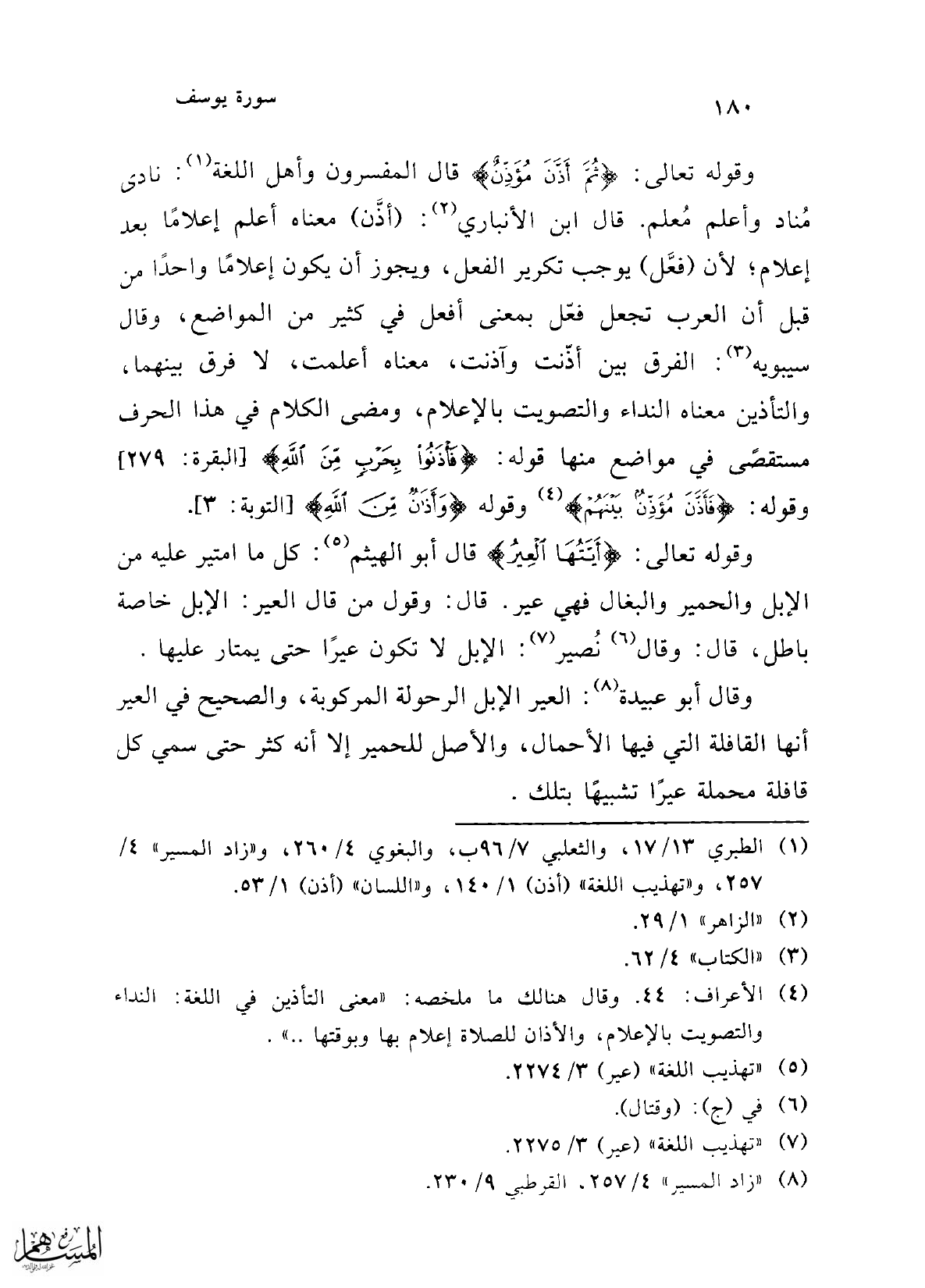 وقوله تعالى: {ثُمَّ أَذَّنَ مُؤَذِّنٌ} قال المفسرون وأهل اللغة (¬1): نادى مُناد وأعلم مُعلم. قال ابن الأنباري (¬2): (أذَّن) معناه أعلم إعلامًا بعد إعلام؛ لأن (فعَّل) يوجب تكرير الفعل، ويجوز أن يكون إعلامًا واحداً من قبل أن العرب تجعل فعّل بمعنى أفعل في كثير من المواضع، وقال سيبويه (¬3): الفرق بين أذّنت وآذنت، معناه أعلمت، لا فرق بينهما، والتأذين معناه النداء والتصويت بالإعلام، ومضى الكلام في هذا الحرف مستقصًى في مواضع منها قوله: {فَأْذَنُوا بِحَرْبٍ مِنَ اللَّهِ} [البقرة: 279] وقوله: {فَأَذَّنَ مُؤَذِّنٌ بَيْنَهُمْ} (¬4) وقوله {وَأَذَانٌ مِنَ اللَّهِ} [التوبة: 3].