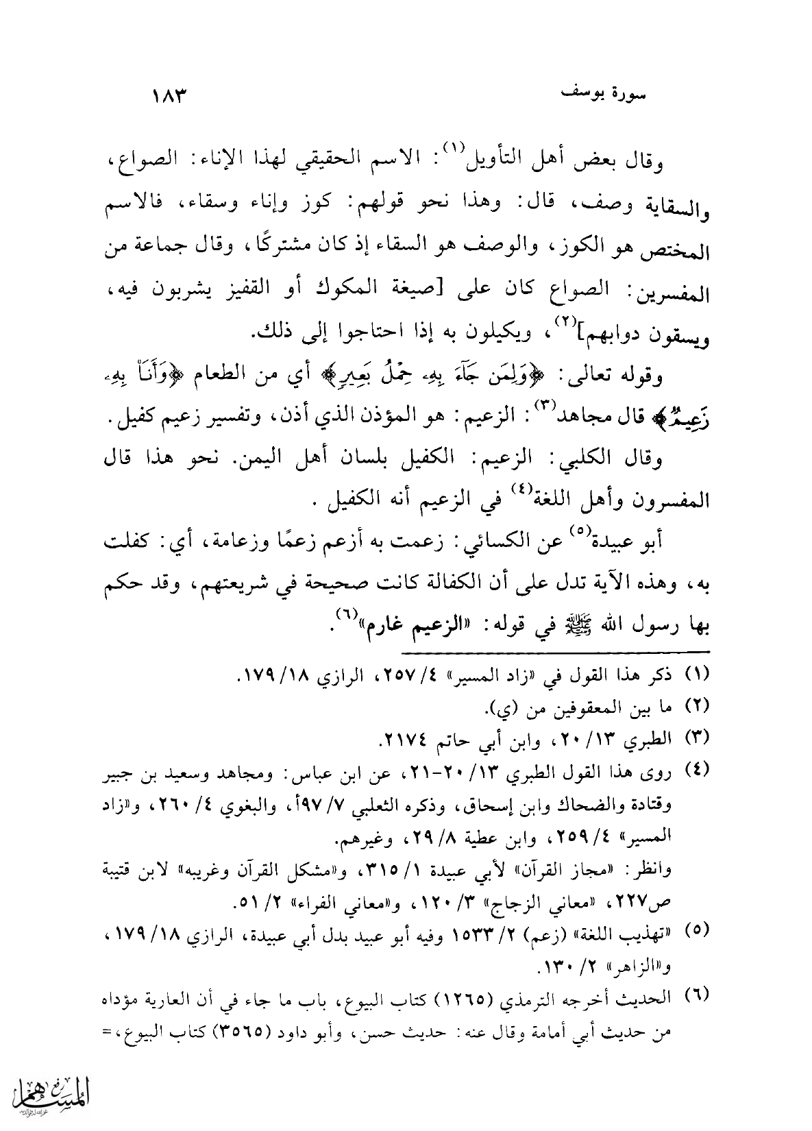 وقوله تعالى: {وَلِمَنْ جَاءَ بِهِ حِمْلُ بَعِيرٍ} أي من الطعام {وَأَنَا بِهِ زَعِيمٌ} قال مجاهد (¬3): الزعيم: هو المؤذن الذي أذن، وتفسير زعيم كفيل.