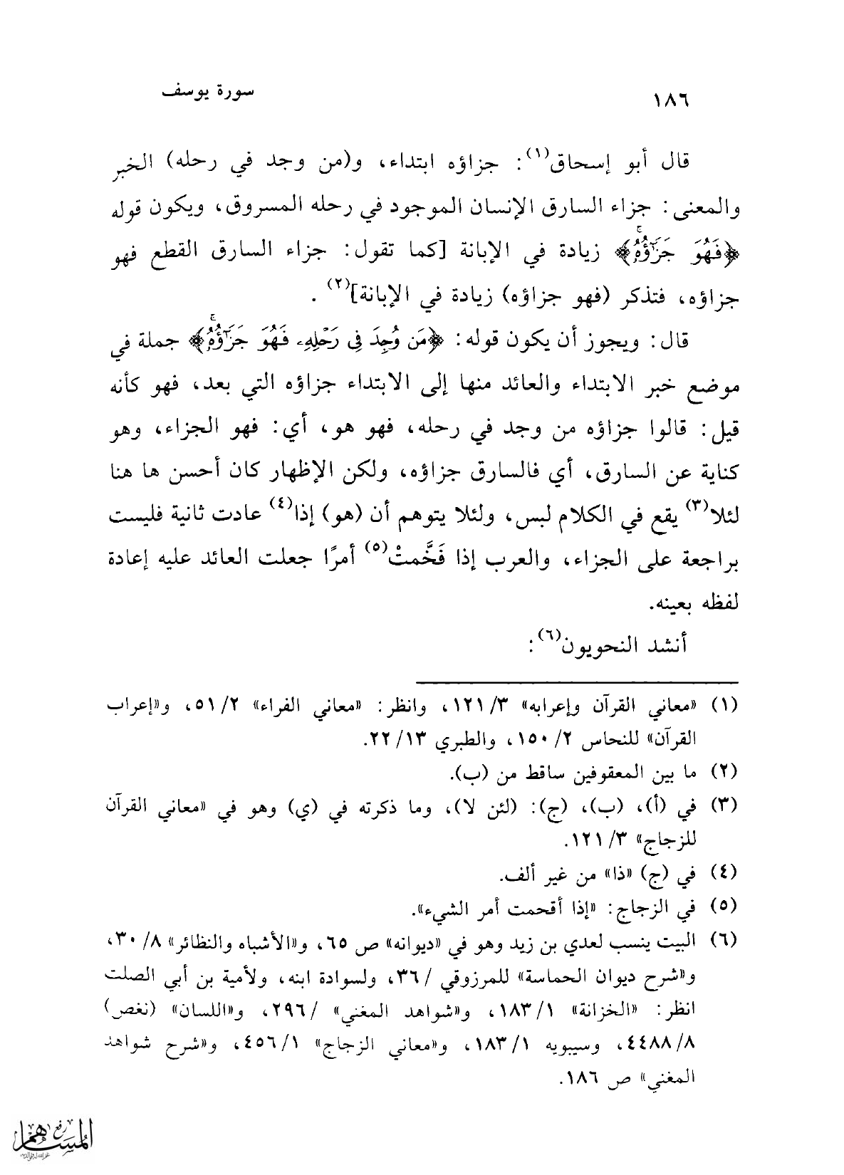 قال: ويجوز أن يكون قوله: {مَنْ وُجِدَ فِي رَحْلِهِ فَهُوَ جَزَاؤُهُ} جملة في موضع خبر الابتداء والعائد منها إلى الابتداء جزاؤه التي بعد، فهو كأنه قيل: قالوا جزاؤه من وجد في رحله، فهو هو، أي: فهو الجزاء، وهو كناية عن السارق، أي فالسارق جزاؤه، ولكن الإظهار كان أحسن هاهنا لئلا (¬3) يقع في الكلام لبس، ولئلا يتوهم أن (هو) إذا (¬4) عادت ثانية فليست براجعة على الجزاء، والعرب إذا فَخَّمتْ (¬5) أمرًا جعلت العائد عليه إعادة لفظه بعينه.