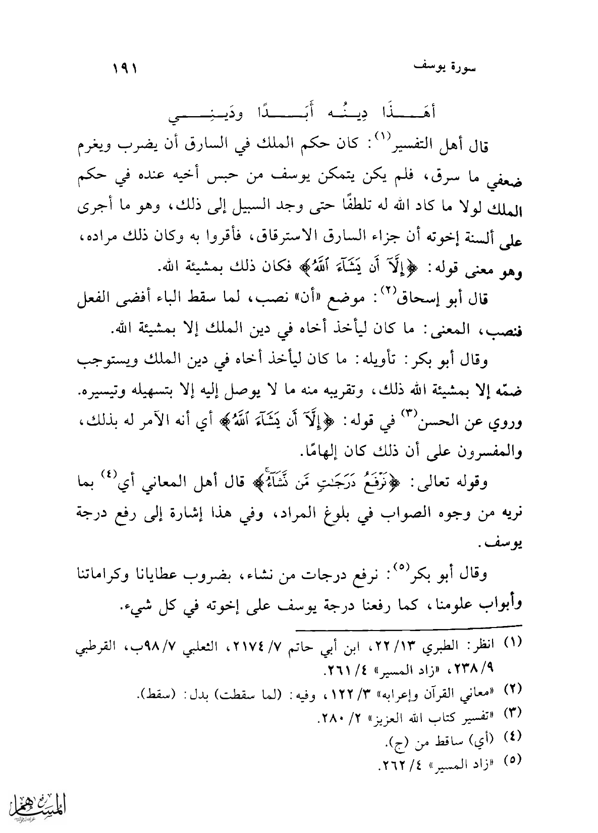 وقال أبو بكر: تأويله: ما كان ليأخذ أخاه في دين الملك ويستوجب ضمّه إلا بمشيئة الله ذلك، وتقريبه منه ما لا يوصل إليه إلا بتسهيله وتيسيره. وروي عن الحسن (¬3) في قوله: {إِلَّا أَنْ يَشَاءَ اللَّهُ} أي أنه الآمر له بذلك، والمفسرون على أن ذلك كان إلهامًا.