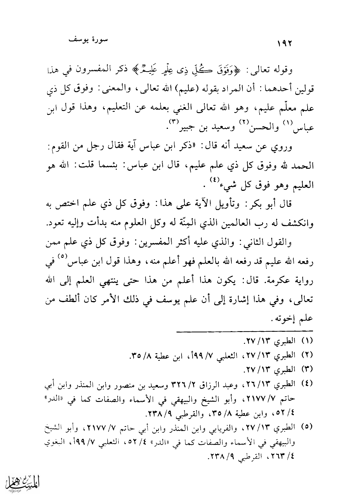 وروي عن سعيد أنه قال: "ذكر ابن عباس آية فقال رجل من القوم: الحمد لله وفوق كل ذي علم عليم، قال ابن عباس: بئسما قلت: الله هو العلم وهو فوق كل شيء (¬4).