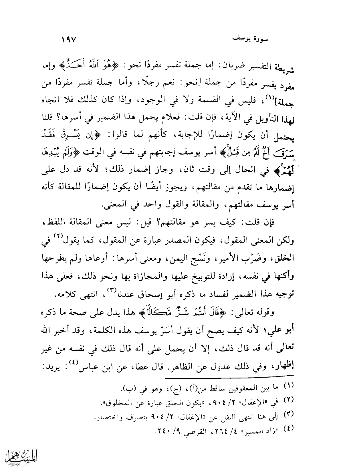 شريطة التفسير ضربان: إما جملة تفسر مفردًا نحو: {قُلْ هُوَ الله أَحَدٌ} وإما مفرد يفسر مفردًا من جملة [نحو: نعم رجلاً، وأما جملة تفسر مفردًا من جملة] (¬1)، فليس في القسمة ولا في الوجود، وإذا كان كذلك فلا اتجاه لهذا التأويل في الآية، فإن قلت: فعلام يحمل هذا الضمير في أسرها؟ قلنا يحتمل أن يكون إضمارًا للإجابة، كأنهم لما قالوا: {إِنْ يَسْرِقْ فَقَدْ سَرَقَ أَخٌ لَهُ مِنْ قَبْلُ} أسر يوسف إجابتهم في نفسه في الوقت {وَلَمْ يُبْدِهَا لَهُمْ} في الحال إلى وقت ثان، وجاز إضمار ذلك؛ لأنه قد دل على إضمارها ما تقدم من مقالتهم، ويجوز أيضًا أن يكون إضمارًا للمقالة كأنه أسر يوسف مقالتهم، والمقالة والقول واحد في المعنى.