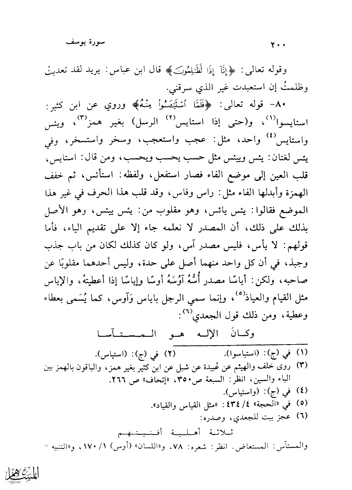 80 - قوله تعالى: {فَلَمَّا اسْتَيْأَسُوا مِنْهُ} وروي عن ابن كثير: استايسوا (¬1)، و (حتى إذا استايس (¬2) الرسل) بغير همز (¬3)، ويئس واستايس (¬4) واحد، مثل: عجيب واستعجب، وسخر واستسخر، وفي يئس لغتان: يئس وييئس مثل حسب يحسب ويحسب، ومن قال: استايس، قلب العين إلى موضع الفاء فصار استفعل، ولفظه: استأئس، ثم خفف الهمزة وأبدلها الفاء مثل: راس وفاس، وقد قلب هذا الحرف في غير هذا الموضع فقالوا: يئس يائس، وهو مقلوب من: يئس ييئس، وهو الأصل بذلك على ذلك، أن المصدر لا نعلمه جاء إلا على تقديم الياء، فأما قولهم: لا يأس، فليس مصدر آس، ولو كان كذلك لكان من باب جذب وجبذ، في أن كل واحد منهما أصل على حدة، وليس أحدهما مقلوبًا عن صاحبه، ولكن: أياسًا مصدر أُسُّهُ آوُسَهُ أوسًا وإياسًا إذا أعطيتهُ، والإياس مثل القيام والعياذ (¬5)، وإنما سمي الرجل باياس وَآوس، كما يُسَمى بعطاء وعطية، ومن ذلك قول الجعدي (¬6):
