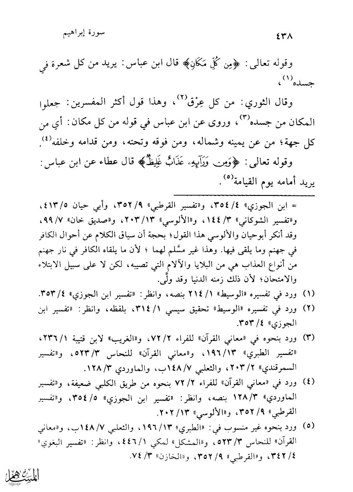 وقال الثوري: من كل عِرْق (¬2)، وهذا قول أكثر المفسرين: جعلوا المكان من جسده (¬3)، وروى عن ابن عباس في قوله من كل مكان: أي من كل جهة؛ من عن يمينه وشماله، ومن فوقه وتحته، ومن قدامه وخلفه (¬4).