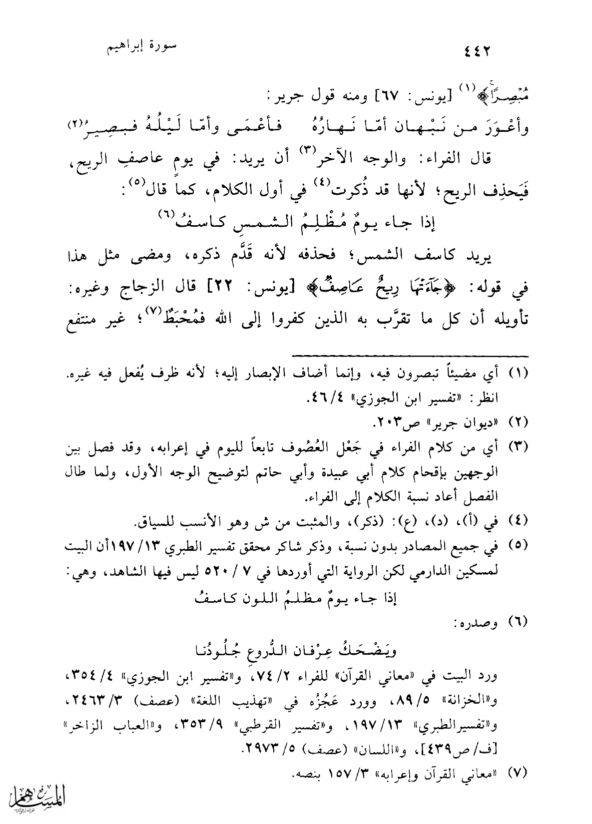 (¬3) أي من كلام الفراء في جَعْل العُصُوف تابعاً لليوم في إعرابه، وقد فصل بين الوجهين بإقحام كلام أبي عبيدة وأبي حاتم لتوضيح الوجه الأول، ولما طال الفصل أعاد نسبة الكلام إلى الفراء.