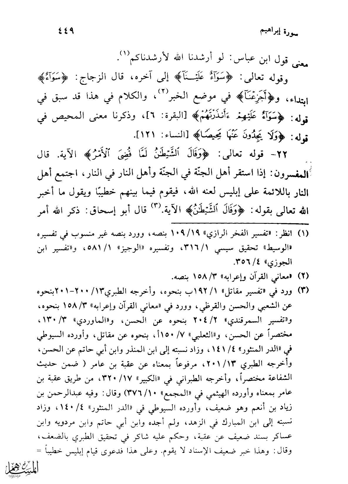 (¬3) ورد في "تفسير مقاتل" 1/ 192 ب بنحوه، وأخرجه الطبري 13/ 200 - 201 بنحوه عن الشعبي والحسن والقرظي، وورد في "معاني القرآن وإعرابه" 3/ 158 بنحوه، و"تفسير السمرقندي" 2/ 204 بنحوه عن الحسن، و"الماوردي" 3/ 130، مختصراً عن الحسن، و"الثعلبي" 7/ 150 أ، بنحوه عن مقاتل، وأورده السيوطي في "الدر المنثور" 4/ 141، وزاد نسبته إلى ابن المنذر وابن أبي حاتم عن الحسن، وأخرجه الطبري 13/ 201، مرفوعاً بمعناه عن عقبة بن عامر (ضمن حديث الثمفاعة مختصراً، وأخرجه الطبراني في "الكبير" 17/ 320، من طريق عقبة بن عامر بمعناه وأورده الهيثمي في "المجمع" 10/ 376، وقال: وفيه عبد الرحمن بن زياد بن أنعم وهو ضعيف، وأورده السيوطي في "الدر المنثور" 4/ 140، وزاد نسبته إلى ابن المبارك في الزهد، ولم أجده وابن أبي حاتم وابن مردويه وابن عساكر بسند ضعيف عن عقبة، وحكم عليه شاكر في تحقيق الطبري بالضعف، وقال: وهذا خبر ضعيف الإسناد لا يقوم. وعلى هذا فدعوى قيام إبليس خطيباً في أهل النار على منبر من نار لا تصح لكونها موقوفة على الحسن والشعبي والقرظي، ولا يقبل قولهم المجرد في مثل هذه القضية الغيبية، والطريق الموصول الذي فيه إشارة لهذه الدعوى - ضعيفٌ لا تقوم به الحجة، فالله أعلم بكيفية هذا الحوار والنقاش بين إبليس وأهل النار.