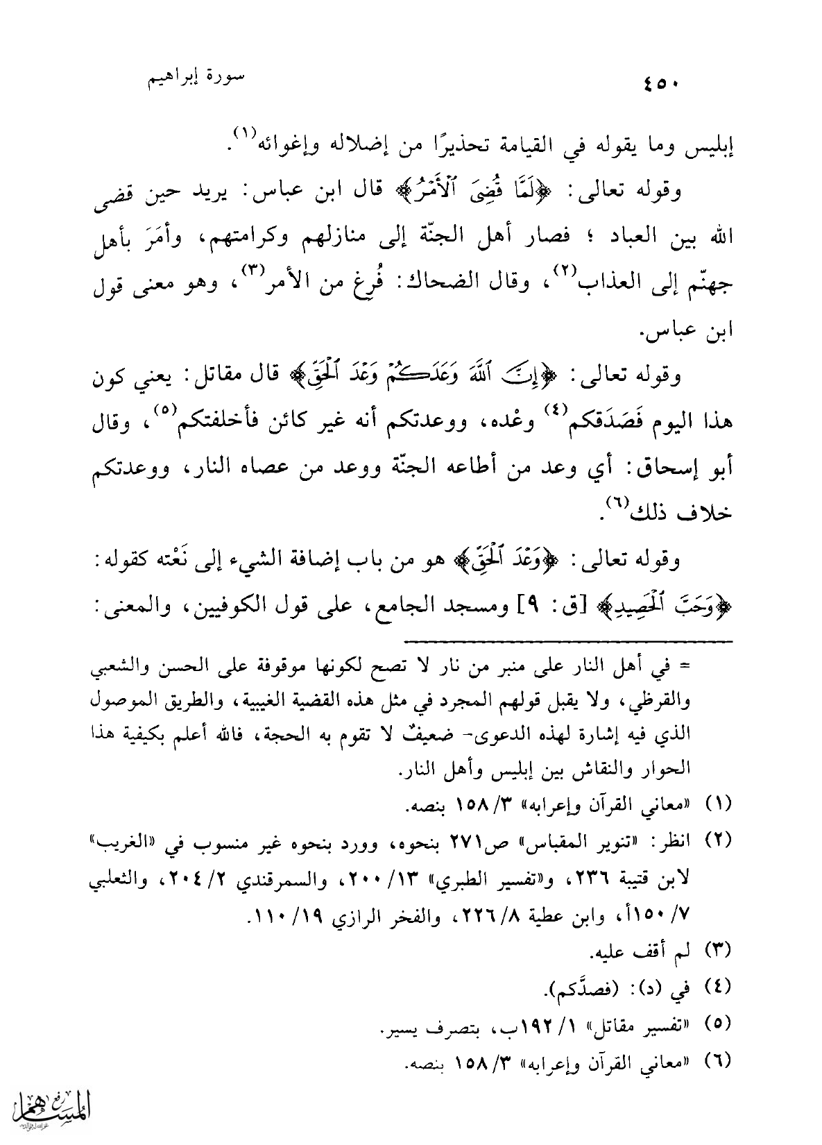 (¬2) انظر: "تنوير المقباس" ص 271 بنحوه، وورد بنحوه غير منسوب في "الغريب" لابن قتيبة 236، و "تفسير الطبري" 13/ 200، والسمرقندي 2/ 204، والثعلبي 7/ 150 أ، وابن عطية 8/ 226، والفخر الرازي 19/ 110.