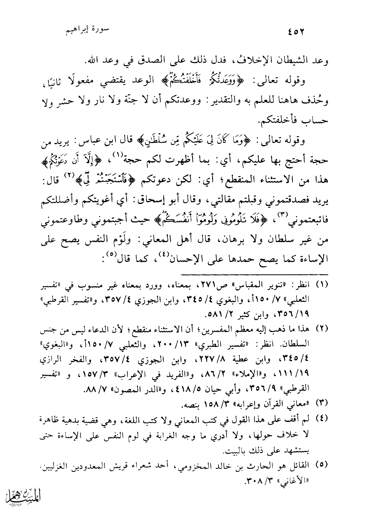 وقوله تعالى: {وَمَا كَانَ لِيَ عَلَيْكُمْ مِنْ سُلْطَانٍ} قال ابن عباس: يريد من حجة أحتج بها عليكم، أي: بما أظهرت لكم حجة (¬1)، {إِلَّا أَنْ دَعَوْتُكُمْ} هذا من الاستثناء المنقطع؛ أي: لكن دعوتكم {فَاسْتَجَبْتُمْ لِي} (¬2) قال: يريد فصدقتموني وقبلتم مقالتي، وقال أبو إسحاق: أي أغويتكم وأضللتكم فاتبعتموني (¬3)، {فَلَا تَلُومُونِي وَلُومُوا أَنْفُسَكُمْ} حيث أجبتموني وطاوعتموني من غير سلطان ولا برهان، قال أهل المعاني: ولَوْم النفس يصح على الإساءة كما يصح حمدها على الإحسان (¬4)، كما قال (¬5):