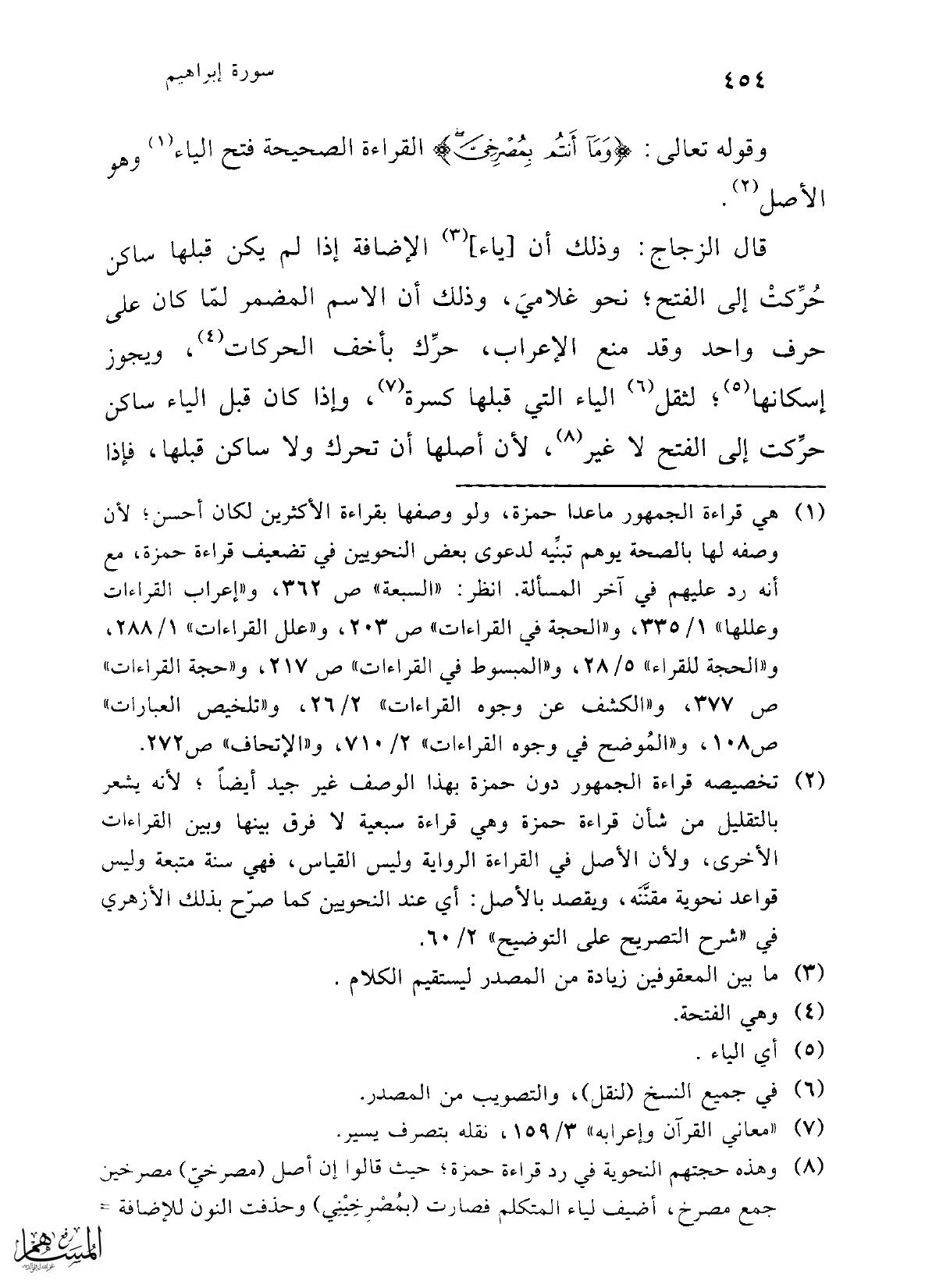 (¬8) وهذه حجتهم النحوية في رد قراءة حمزة؛ حيث قالوا إن أصل (مصرخيّ) مصرخين جمع مصرخ، أضيف لياء اليكلم فصارت (بمُصْرِخِيني) وحذفت النون للإضافة =