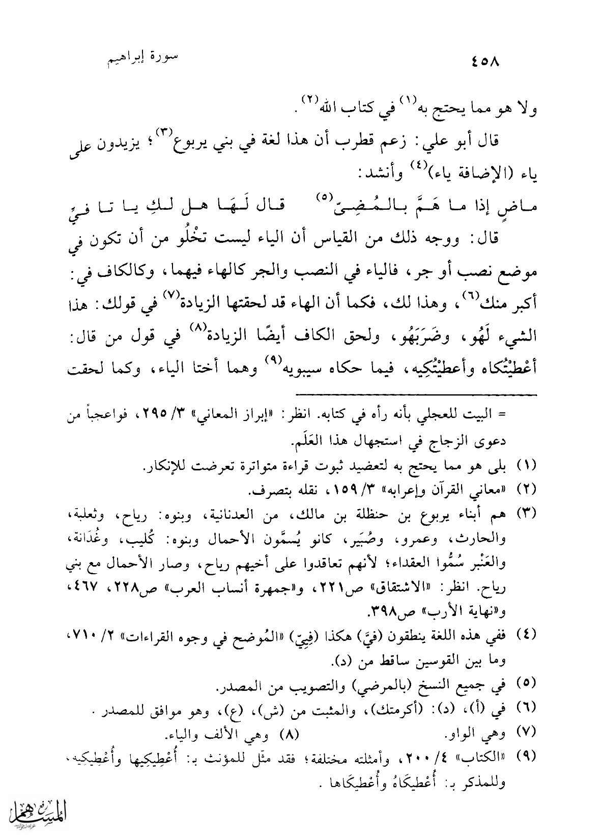 قال أبو علي: زعم قطرب أن هذا لغة في بني يربوع (¬3)؛ يزيدون على ياء (الإضافة ياء) (¬4) وأنشد: